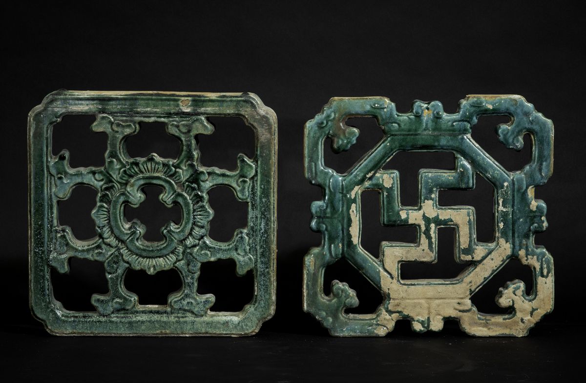 Coppia di elementi in grès a smalti policromi con decori geometrici e floreali, Cina, Dinastia Ming, XIV-XVII secolo