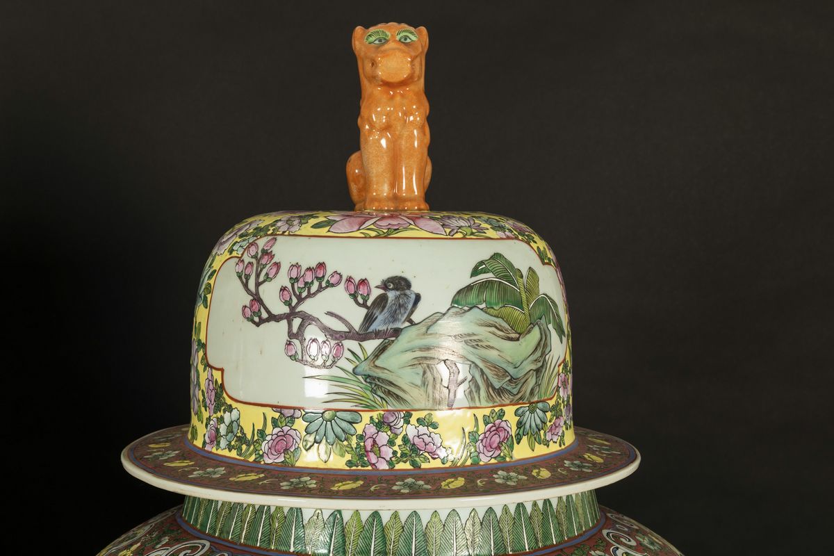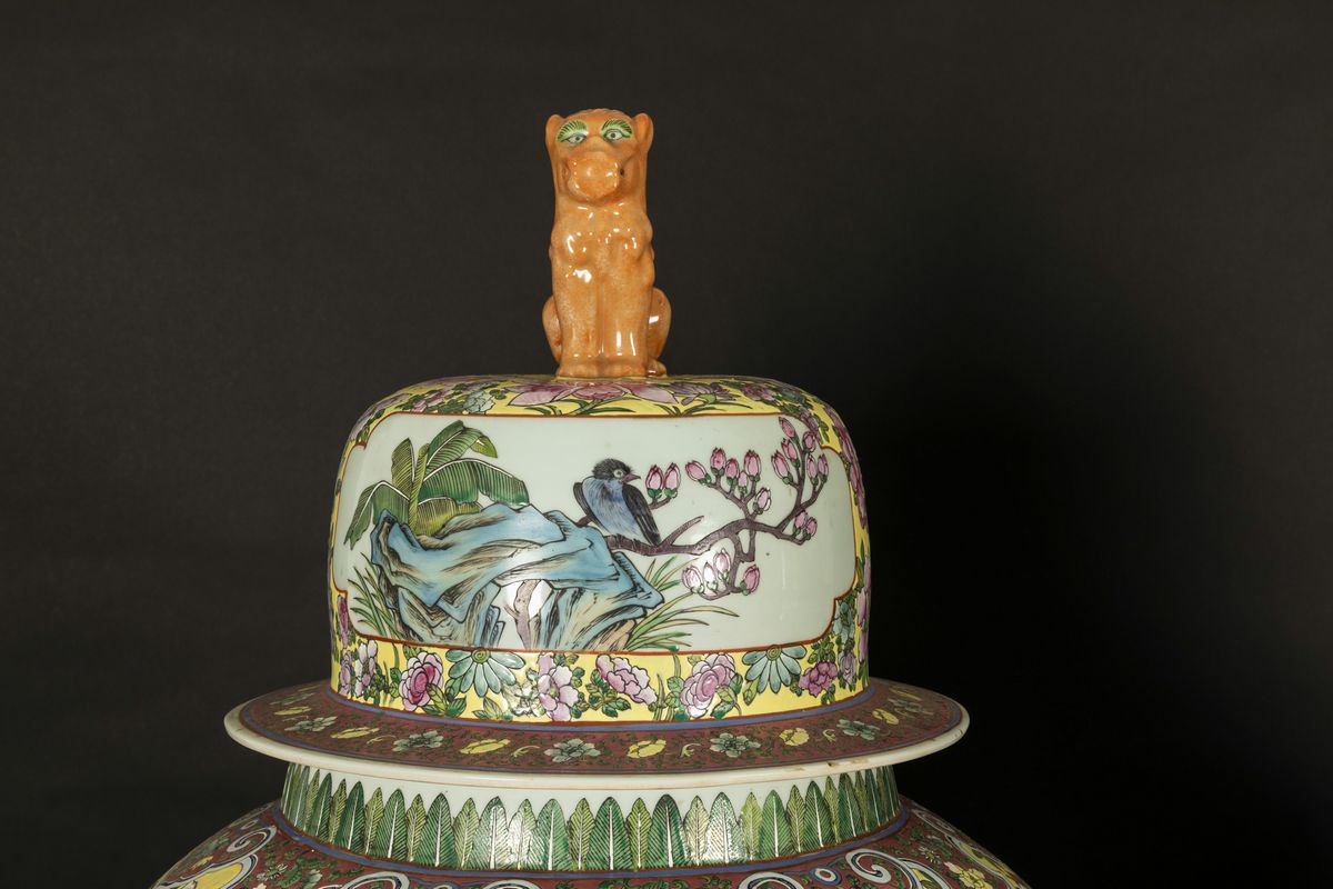 Coppia di grandi potiches in porcellana a smalti policromi con scene raffiguranti saggi entro riserve, decori florali e presa a foggia di cani di Pho, Cina, XX secolo