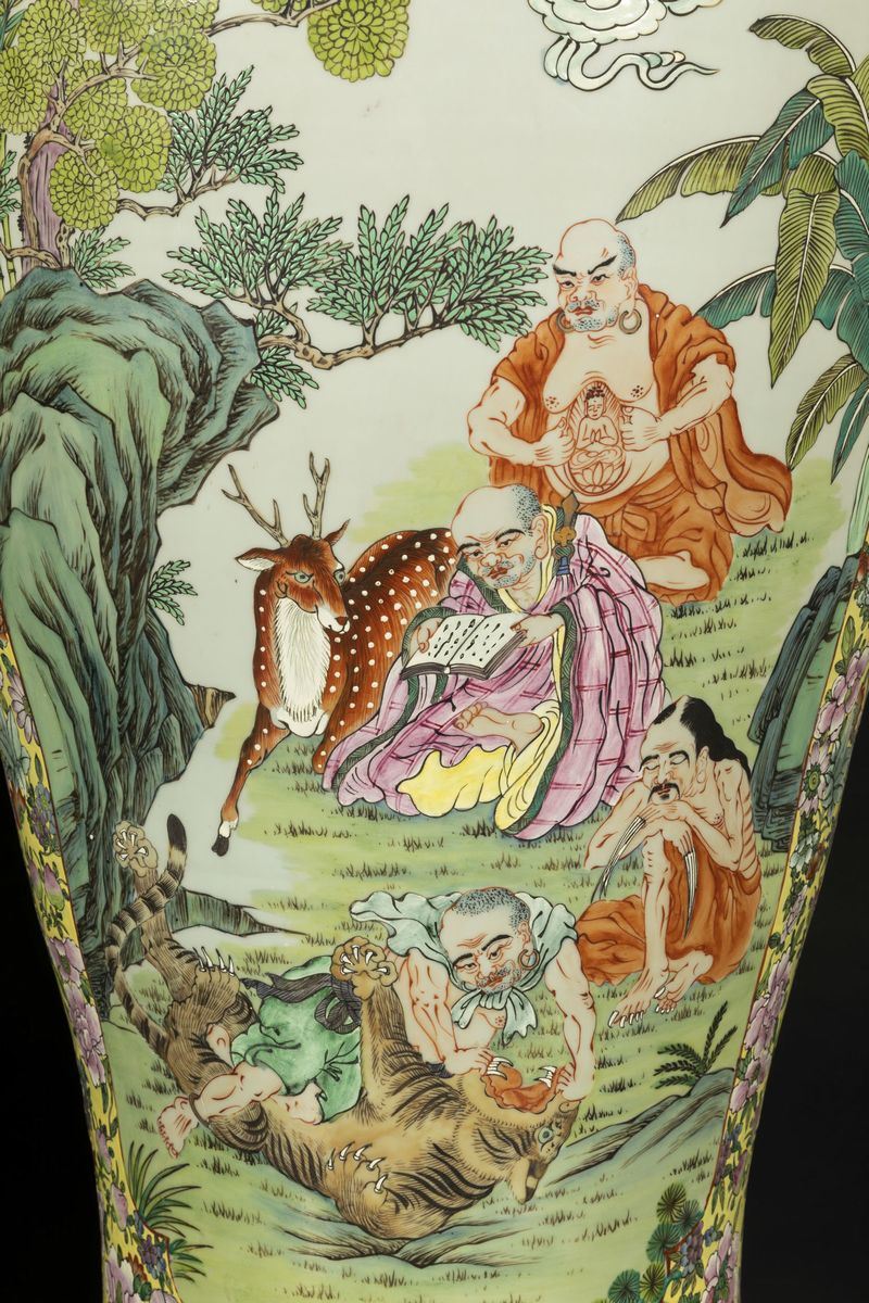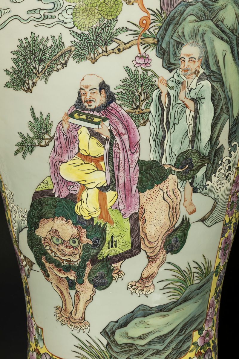 Coppia di grandi potiches in porcellana a smalti policromi con scene raffiguranti saggi entro riserve, decori florali e [..]