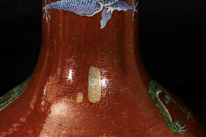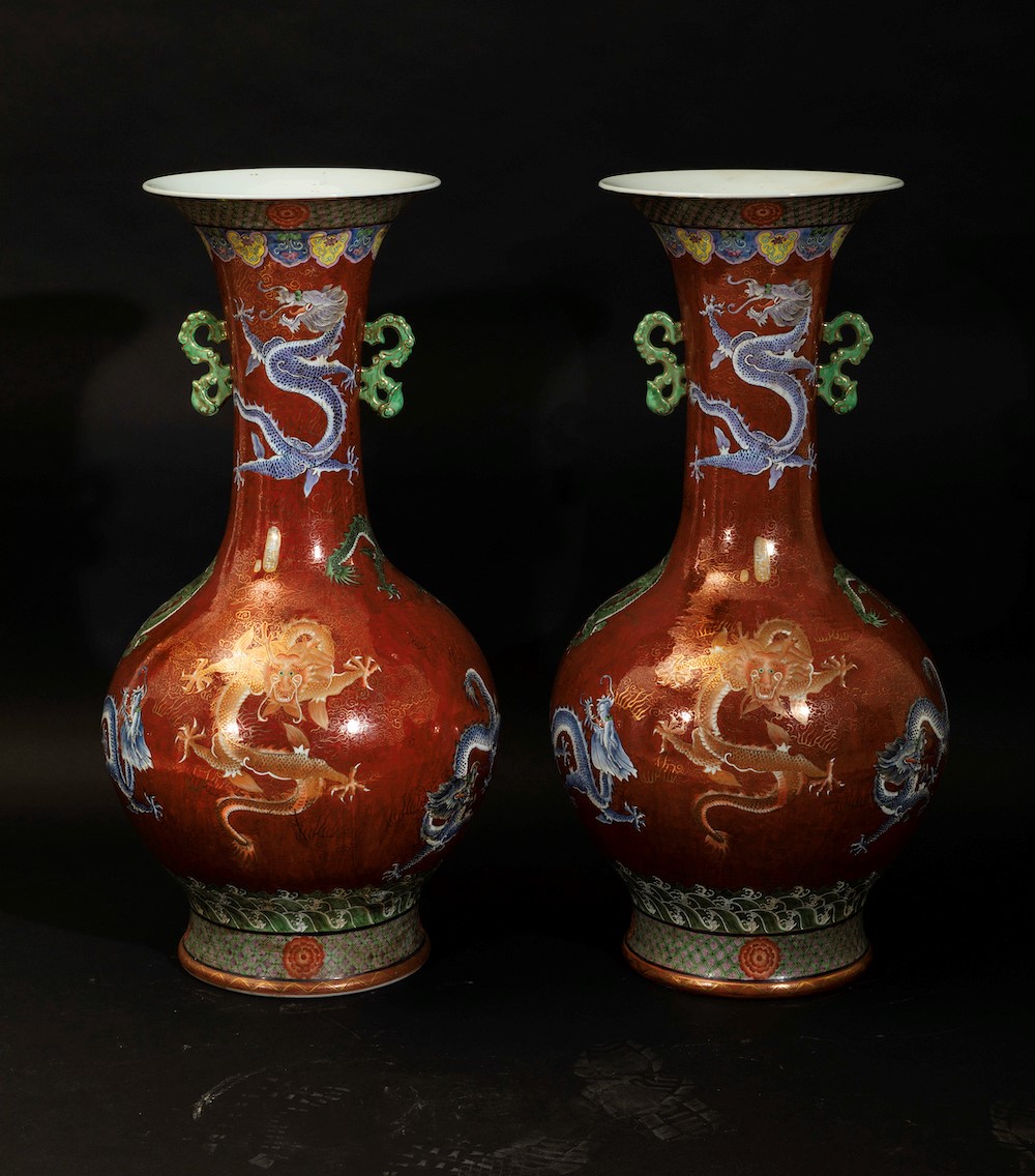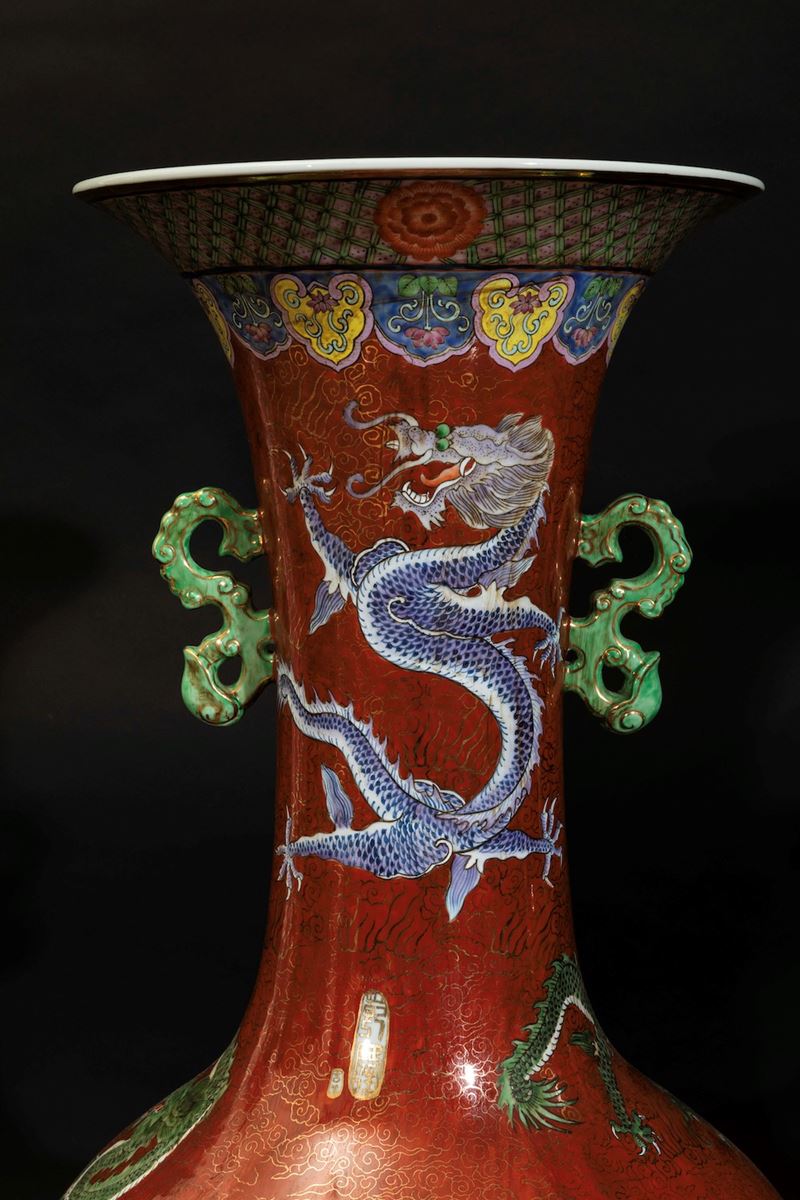 Coppia di grandi vasi a doppia ansa in porcellana a smalti policromi con figure di draghi su fondo rosso, Cina, XX secolo [..]