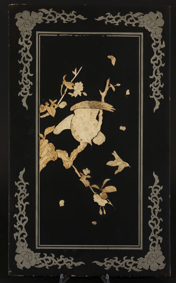 Coppia di pannelli in legno laccato con applicazioni in avorio raffiguranti decoro di uccellini tra i rami, Cina, inizi [..]