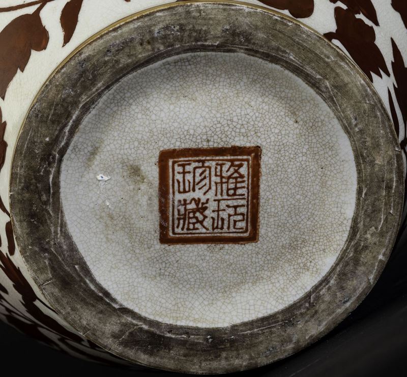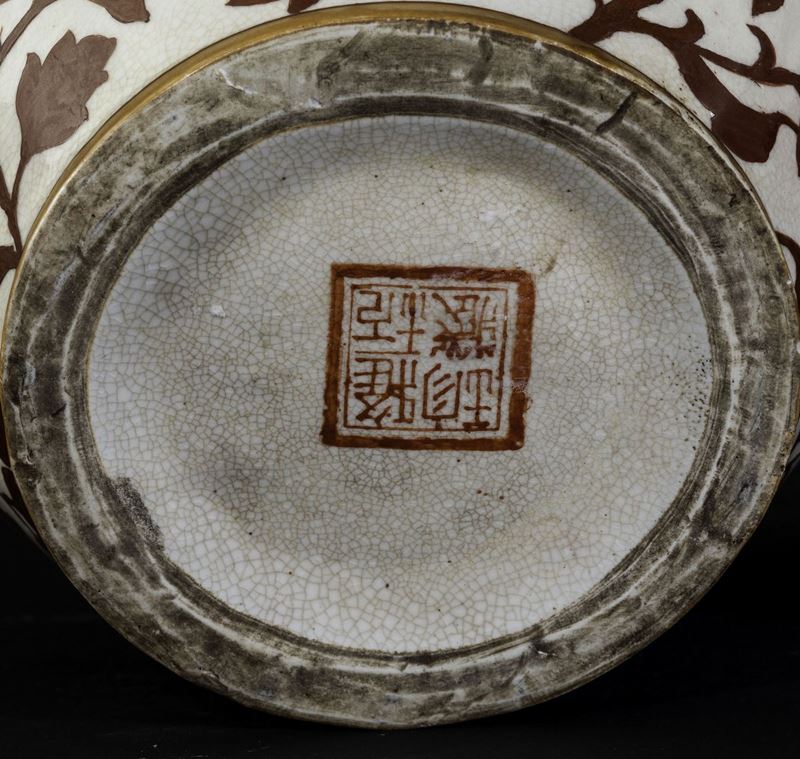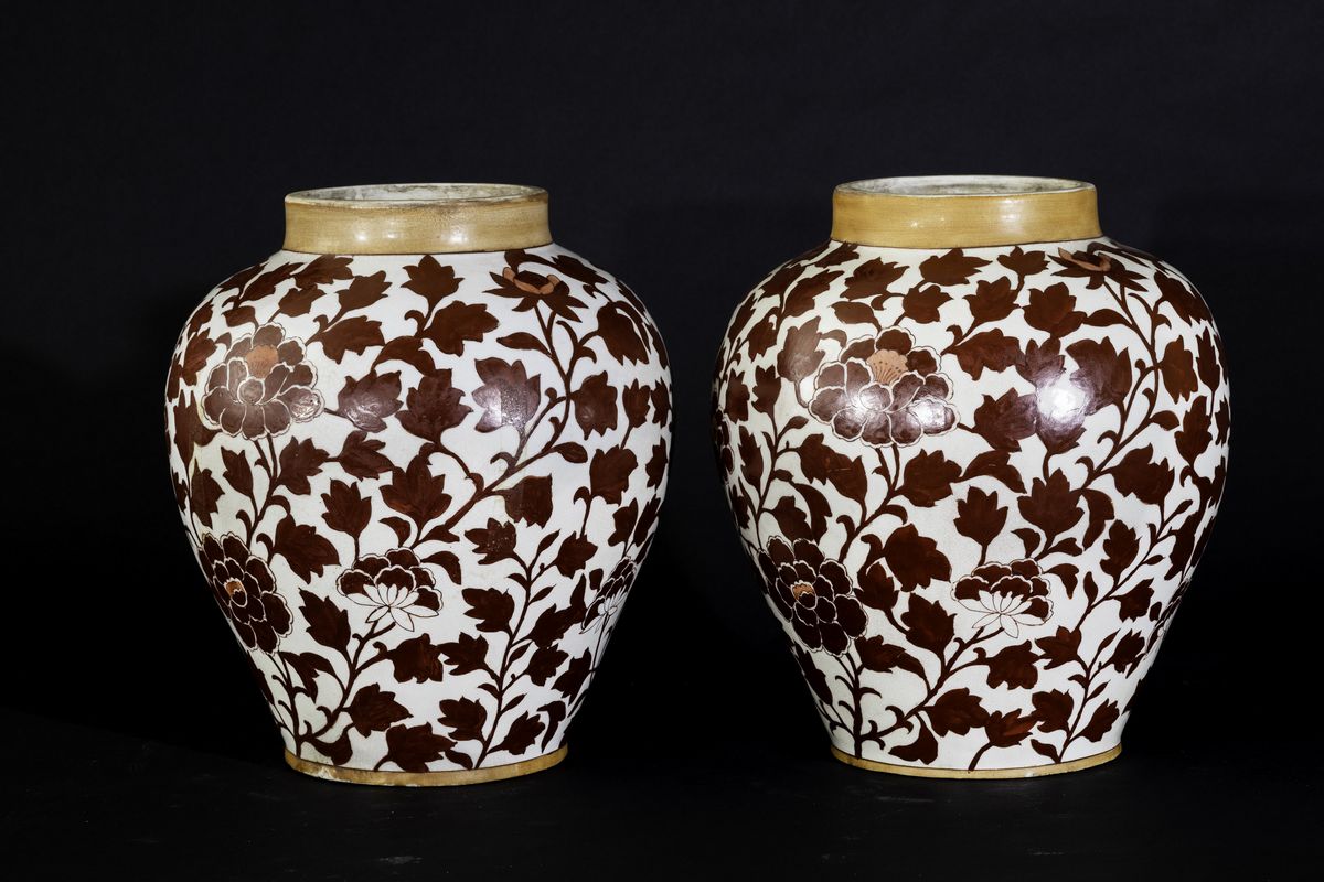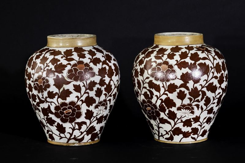 Coppia di potiches senza coperchio in grès a smalti policromi con doro floreale sui toni del rosso, Cina, inizio XX seco [..]