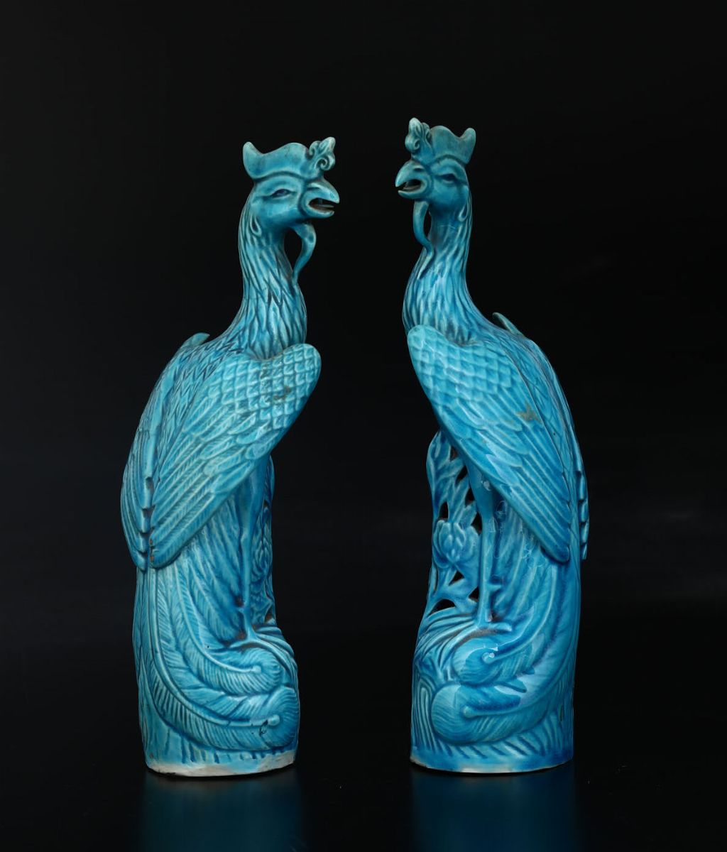 Coppia di sculture a foggia di fenice in porcellana a smalti policromi sui toni del azzurro, Cina, Dinastia Qing, XIX secolo