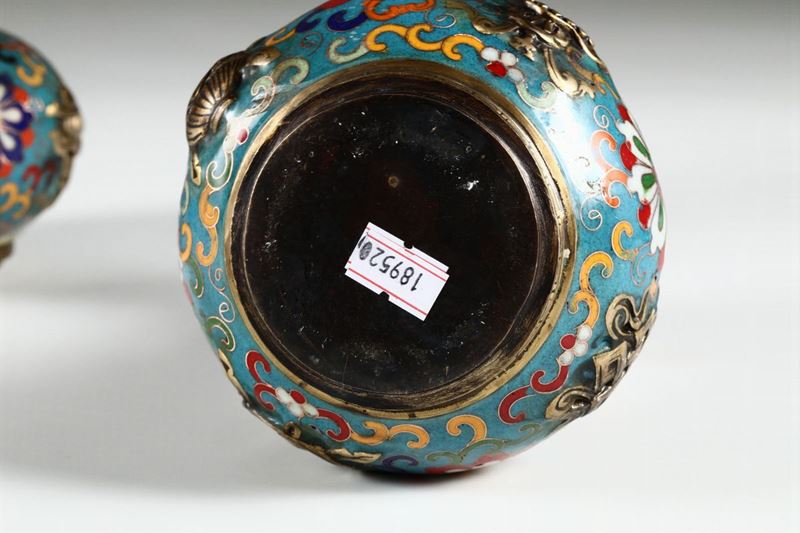 Coppia di vasi a smalti cloisonnè con decoro di fiori di loto, ruota della giustizia a rilievo e manici a foggia di ruyi, [..]