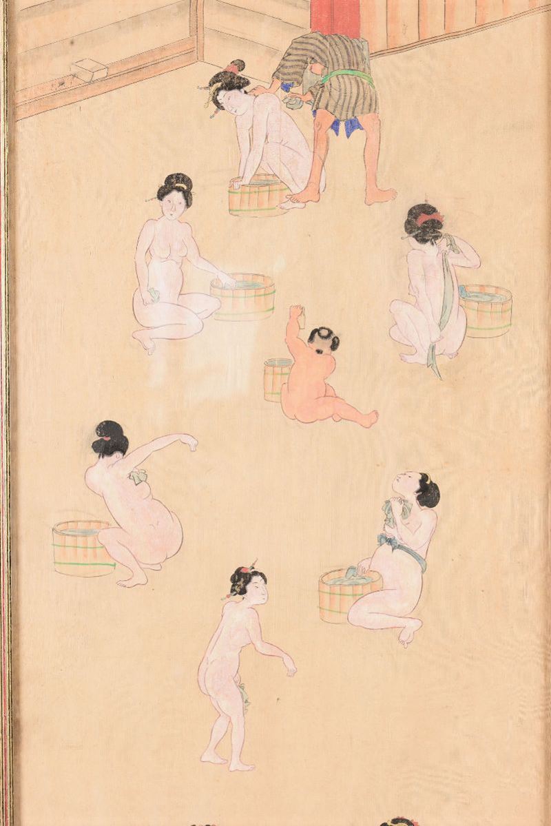 Dipinto su seta raffigurante scena di vita comune con Geishe, Giappone, periodo Meiji (1868-1912)