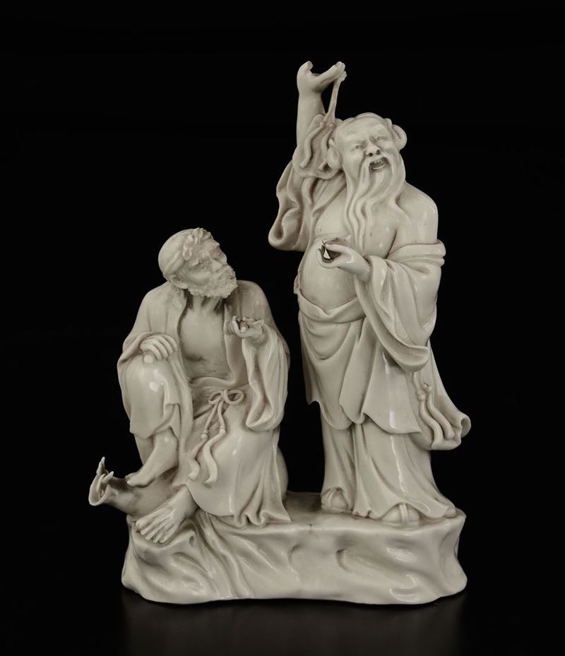 Due gruppi in porcellana Blanc de Chine raffiguranti Guanyin seduta su fiore di loto con cagnolino e Budai con saggio, Cina, [..]