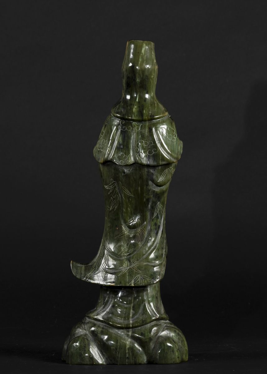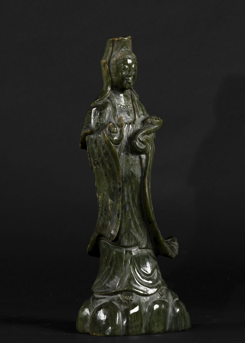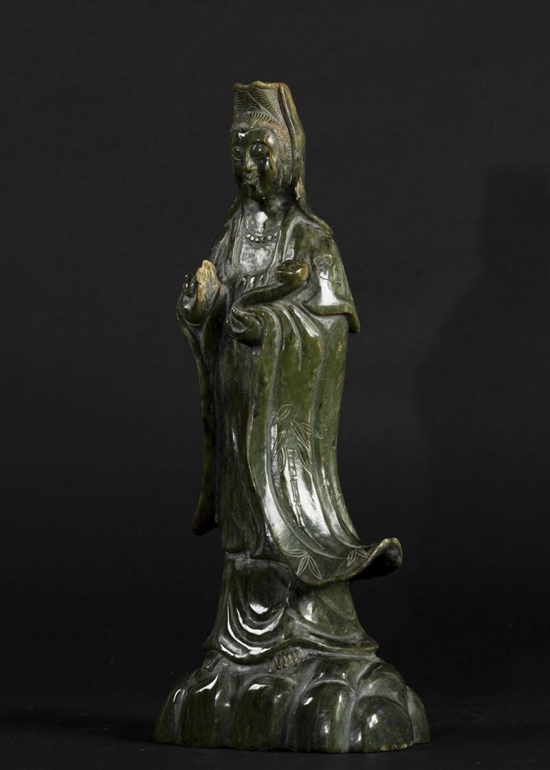 Figura di Guanyin eretta con ruyi scolpita in giada spinacio, Cina, fine XIX secolo