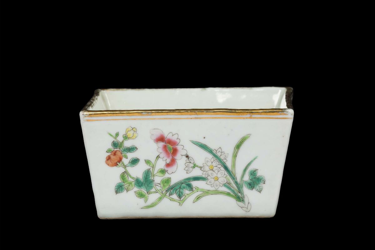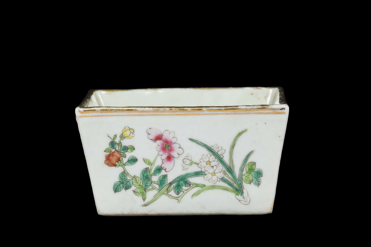 Giardiniera in porcellana a smalti policromi con motivi floreali, profili dorati e iscrizione, Cina, Dinastia Qing, XIX secolo