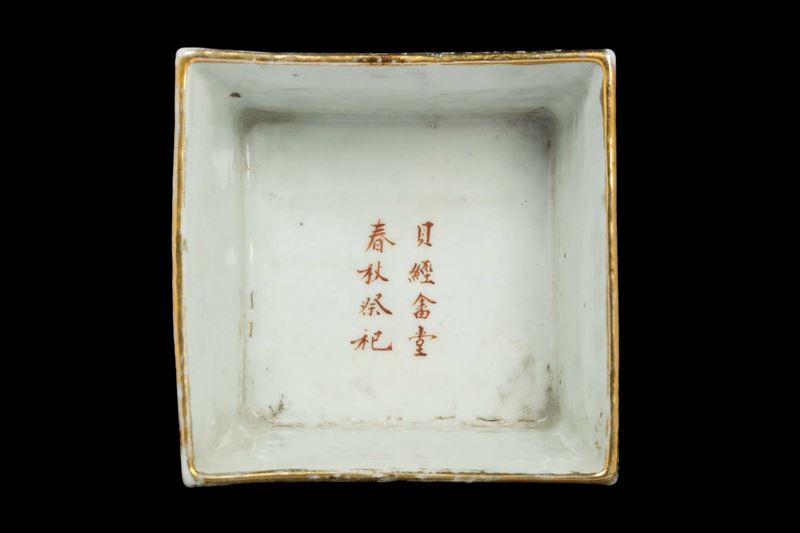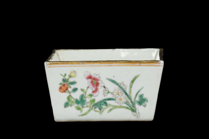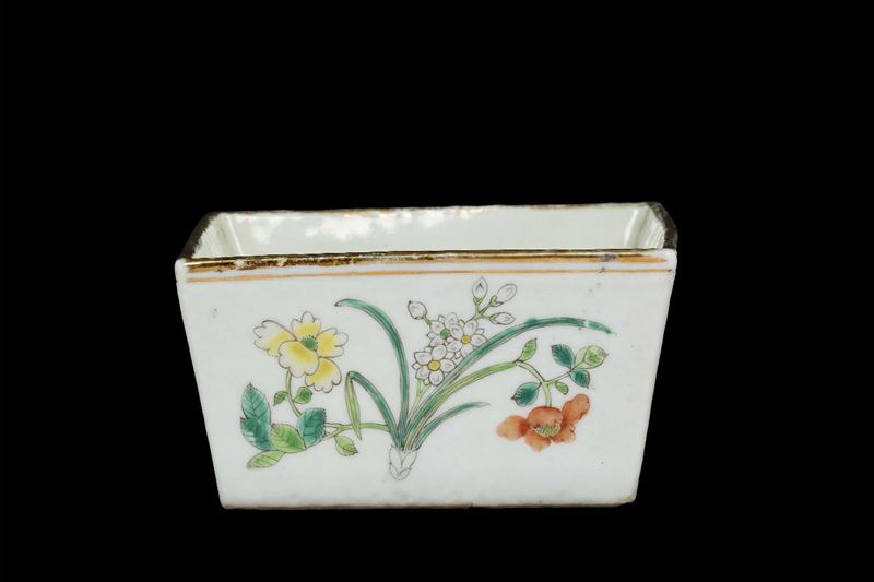 Giardiniera in porcellana a smalti policromi con motivi floreali, profili dorati e iscrizione, Cina, Dinastia Qing, XIX [..]