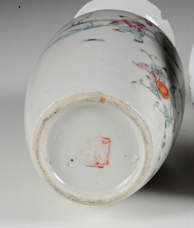 Lotto composto da piccolo vaso in porcellana a smalti policromi raffigurante scena di vita comune e piattino in porcellana [..]
