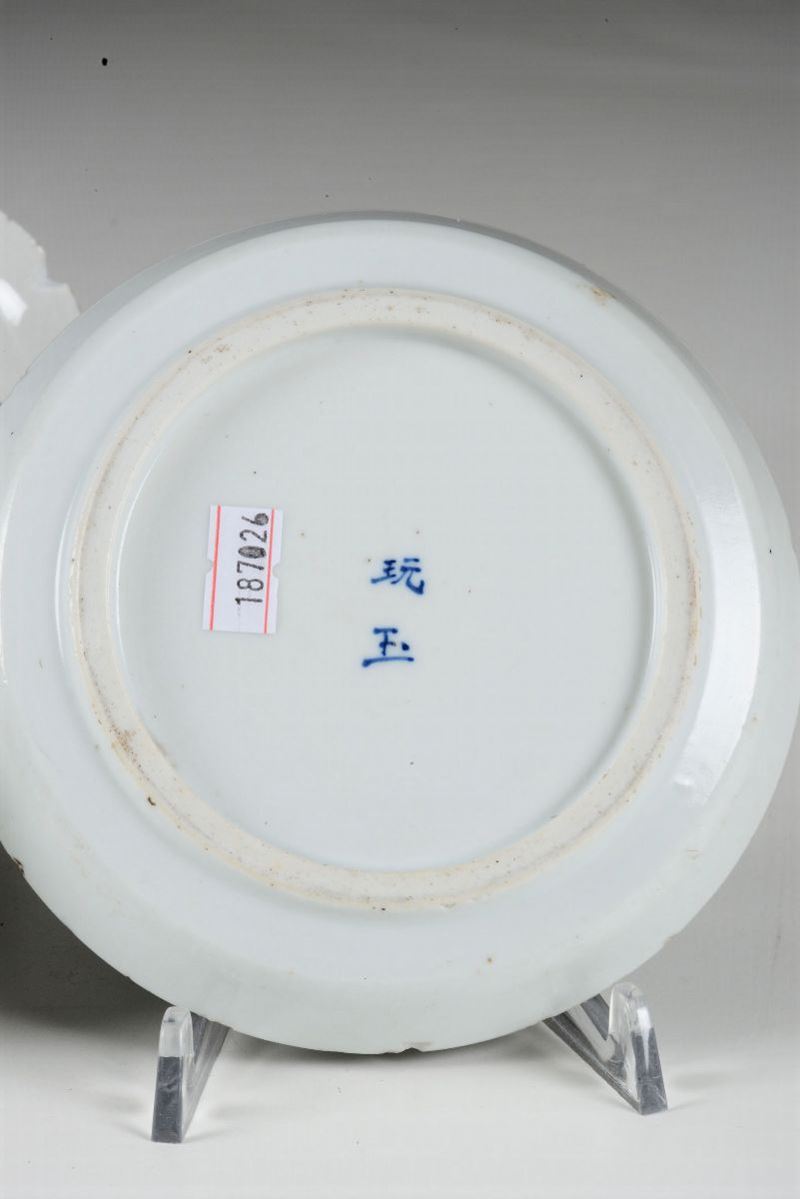 Lotto composto da piccolo vaso in porcellana a smalti policromi raffigurante scena di vita comune e piattino in porcellana bianca e blu con decoro naturalistico e iscrizione, Cina, Dinastia Qing, fine XIX secolo