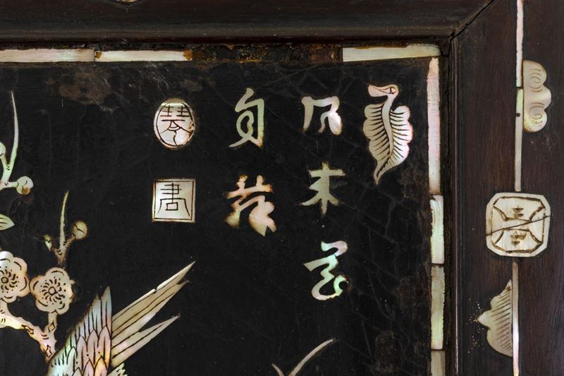 Pannello in legno con intarsi in madreperla raffigurante uccellini tra i rami e iscrizione, Cina, XX secolo