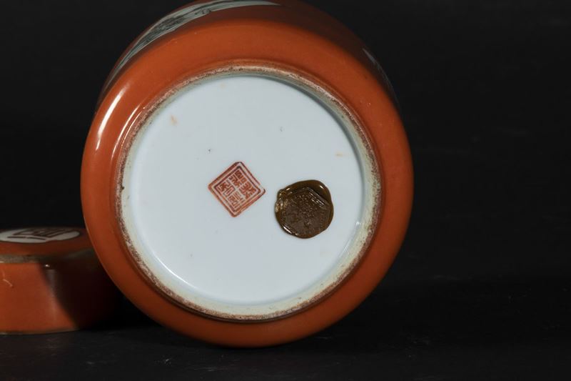 Piccolo porta tè con coperchio in porcellana a smalti policromi con figure di carpe entro riserve su fondo arancio, Cina, [..]