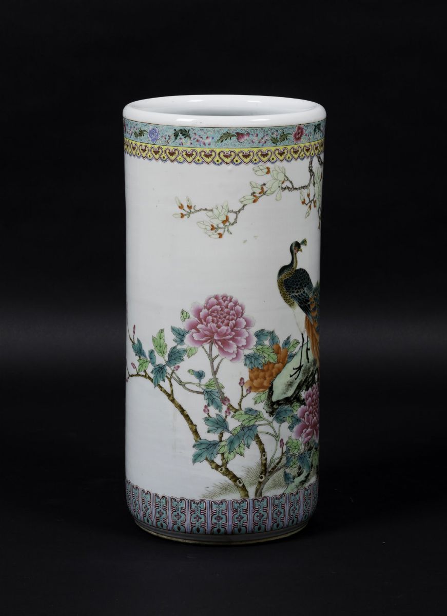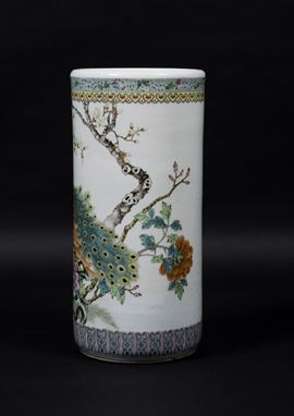 Portaombrelli in porcellana a smalti policromi con figura di pavone e alberi in fiore, Cina, XX secolo