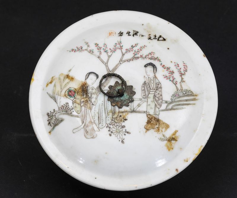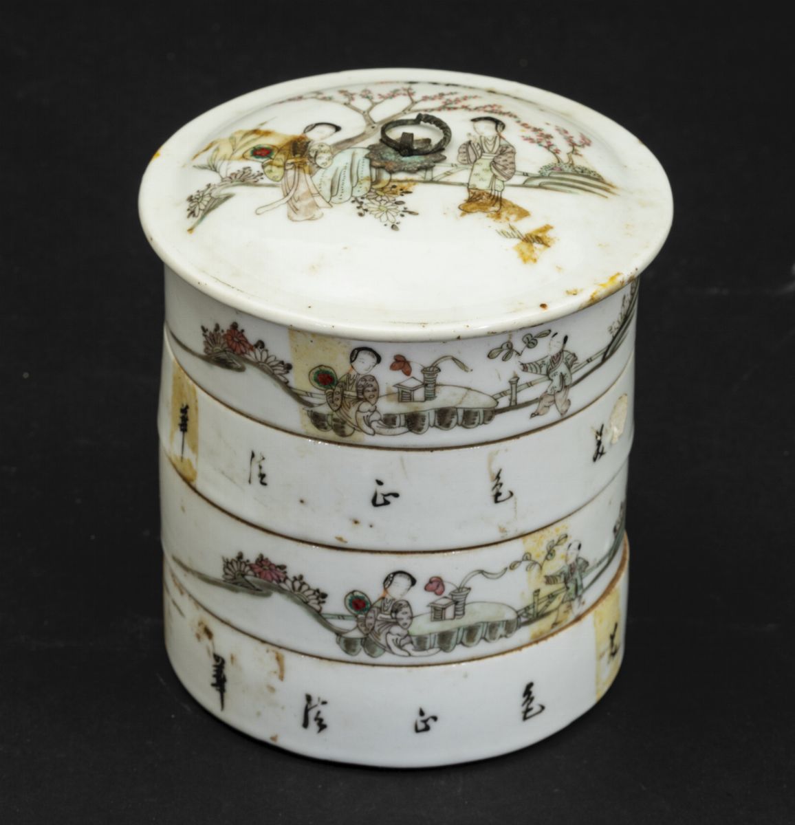 Portavivande in porcellana a smalti policromi con decori floreali su fondo blu, Cina, Dinastia Qing, XIX secolo