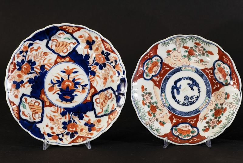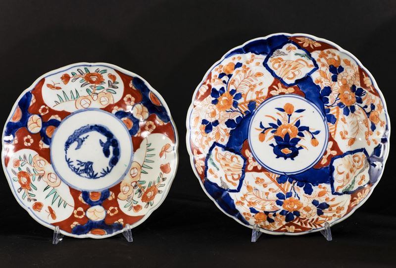 Quattro piatti in porcellana Imari con decori floreali e naturalistici, Giappone, XIX secolo