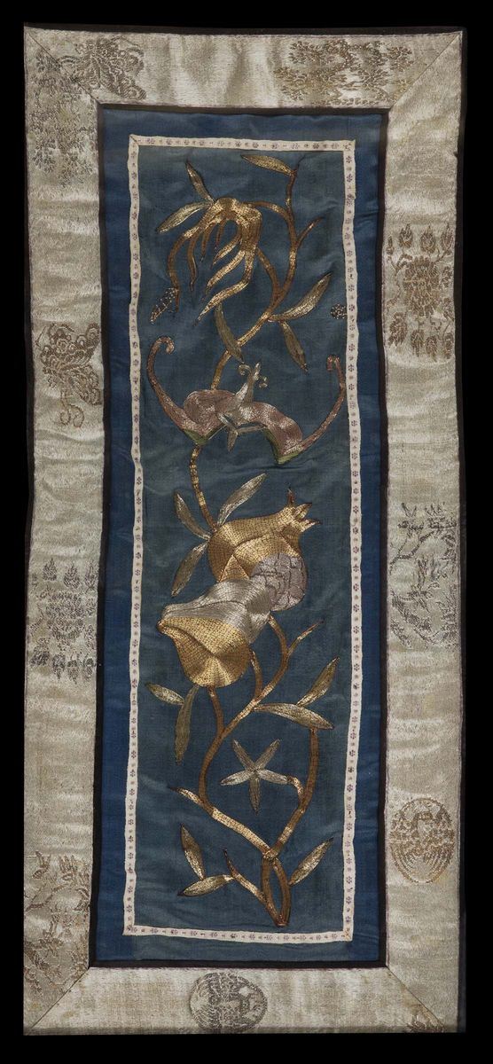 Tessuto in seta ricamata con pesche e pipistrelli in filo d'argento incorniciato, Cina, Dinastia Qing, XIX secolo
