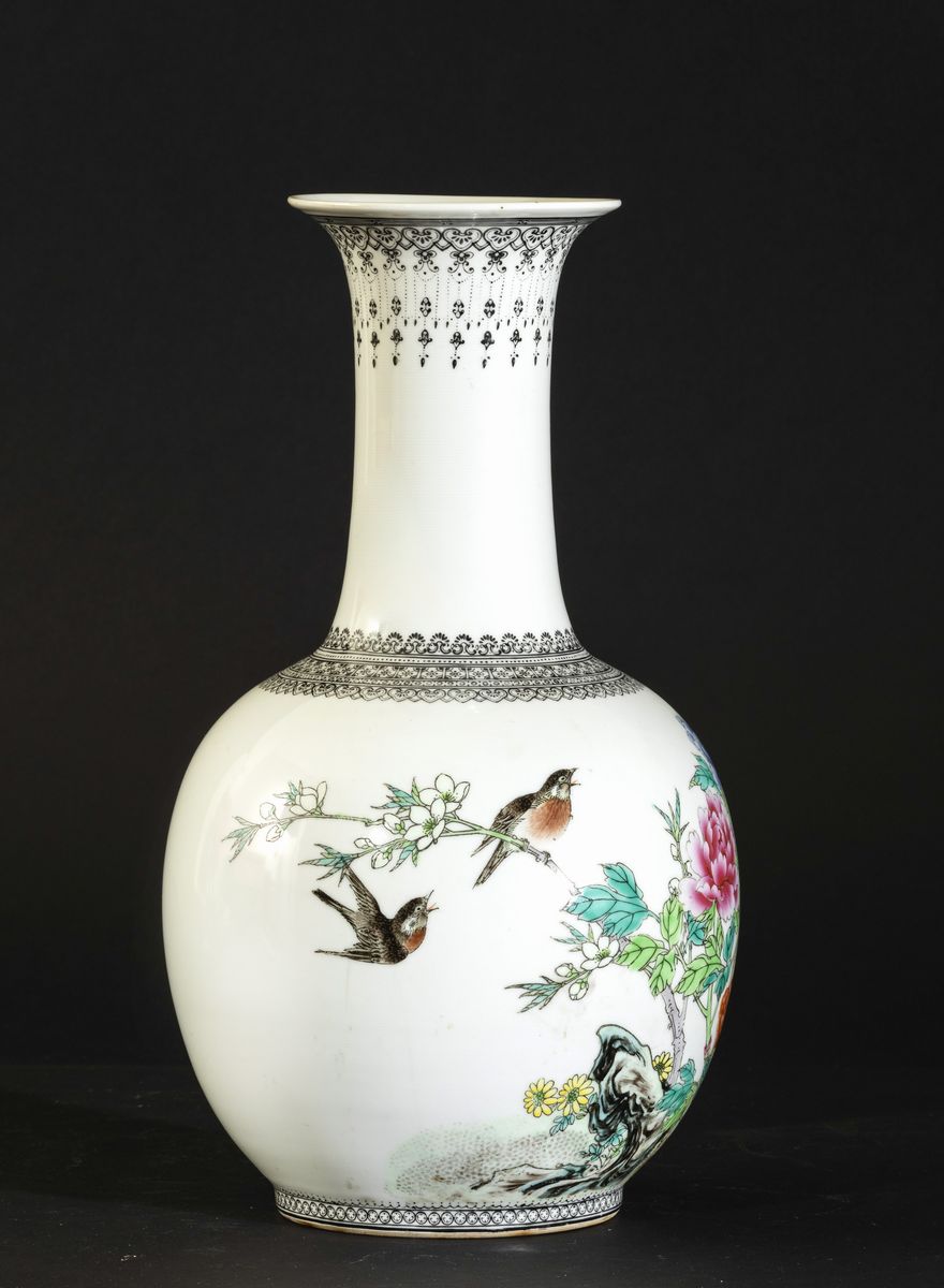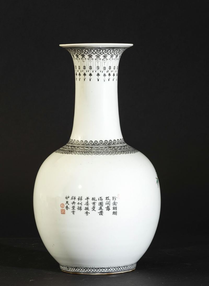Vaso a bottiglia in porcellana a smalti policromi con decoro naturalistico di uccellini e fiori e iscrizione, Cina, inizi [..]