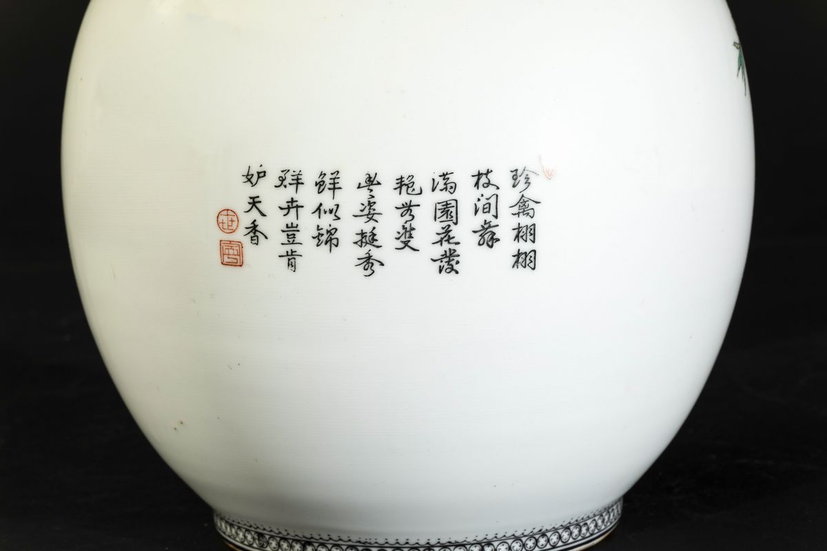 Vaso a bottiglia in porcellana a smalti policromi con decoro naturalistico di uccellini e fiori e iscrizione, Cina, inizi XX secolo