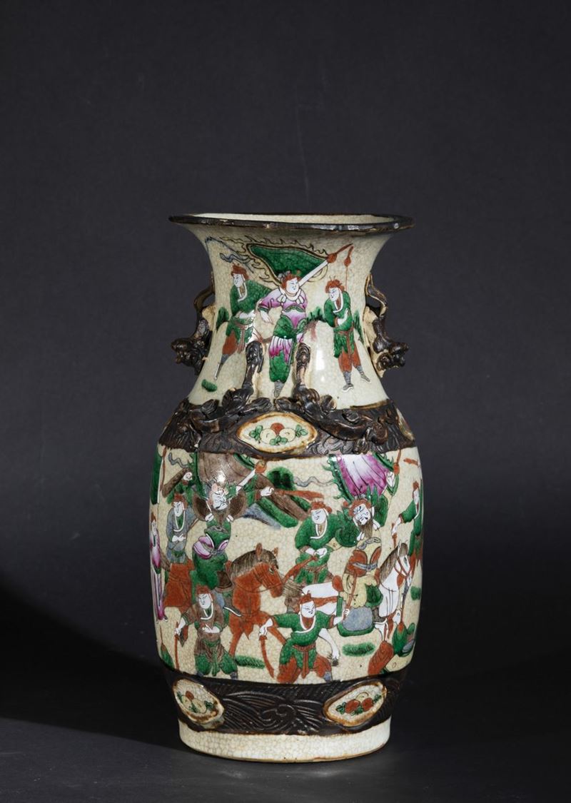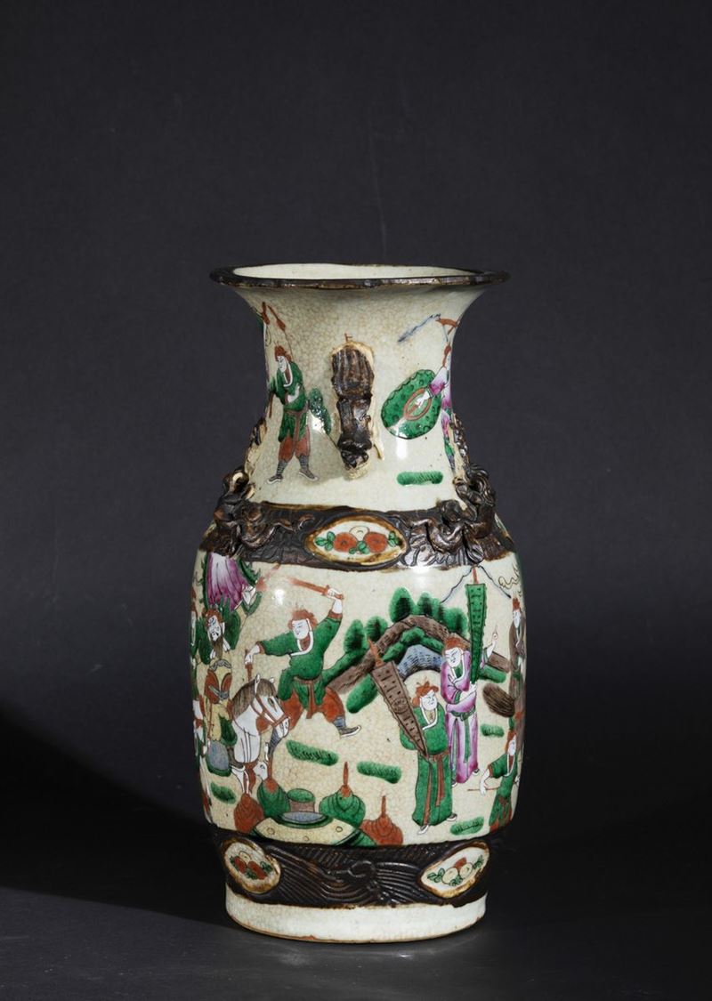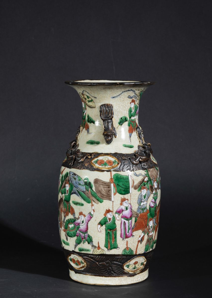 Vaso in porcellana a smalti policromi con figure di guerrieri e decori a foggia di piccoli draghi a rilievo, Cina, Dinastia Qing, fine XIX secolo