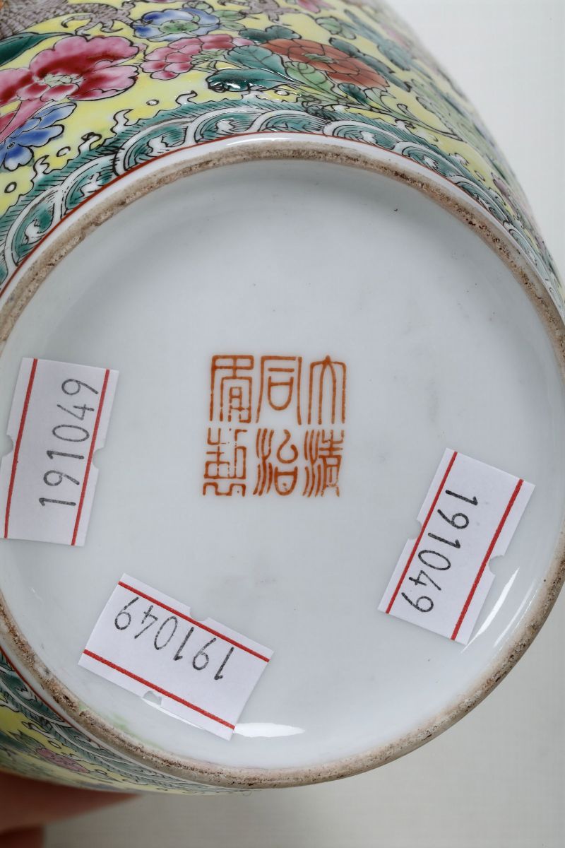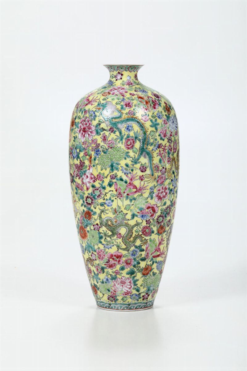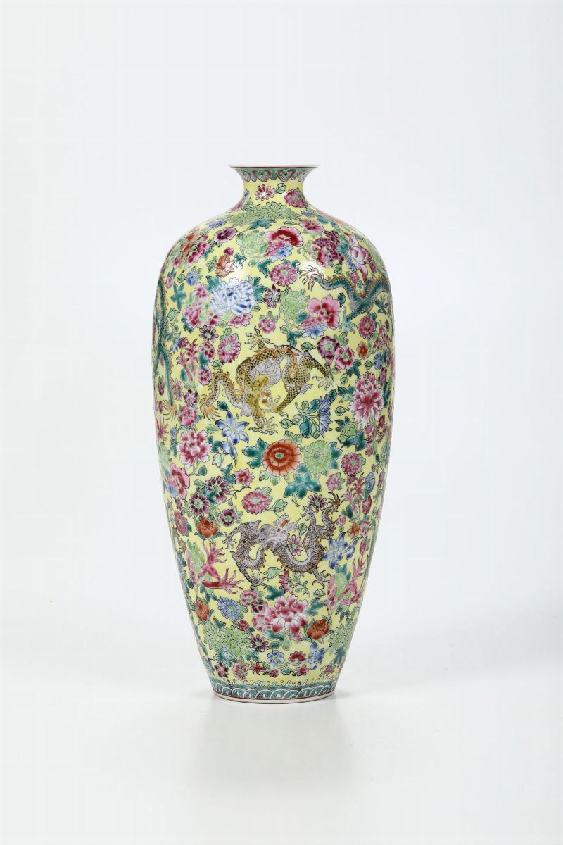 Vaso Meiping in porcellana a smalti policromi con figure di draghi e decoro floreale su fondo giallo, Cina, XX secolo