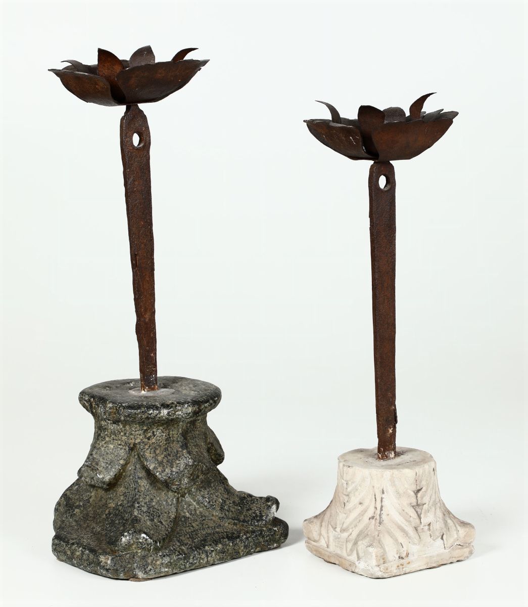 Coppia di torcere in ferro battuto su basi in marmo, XVII-XVIII secolo