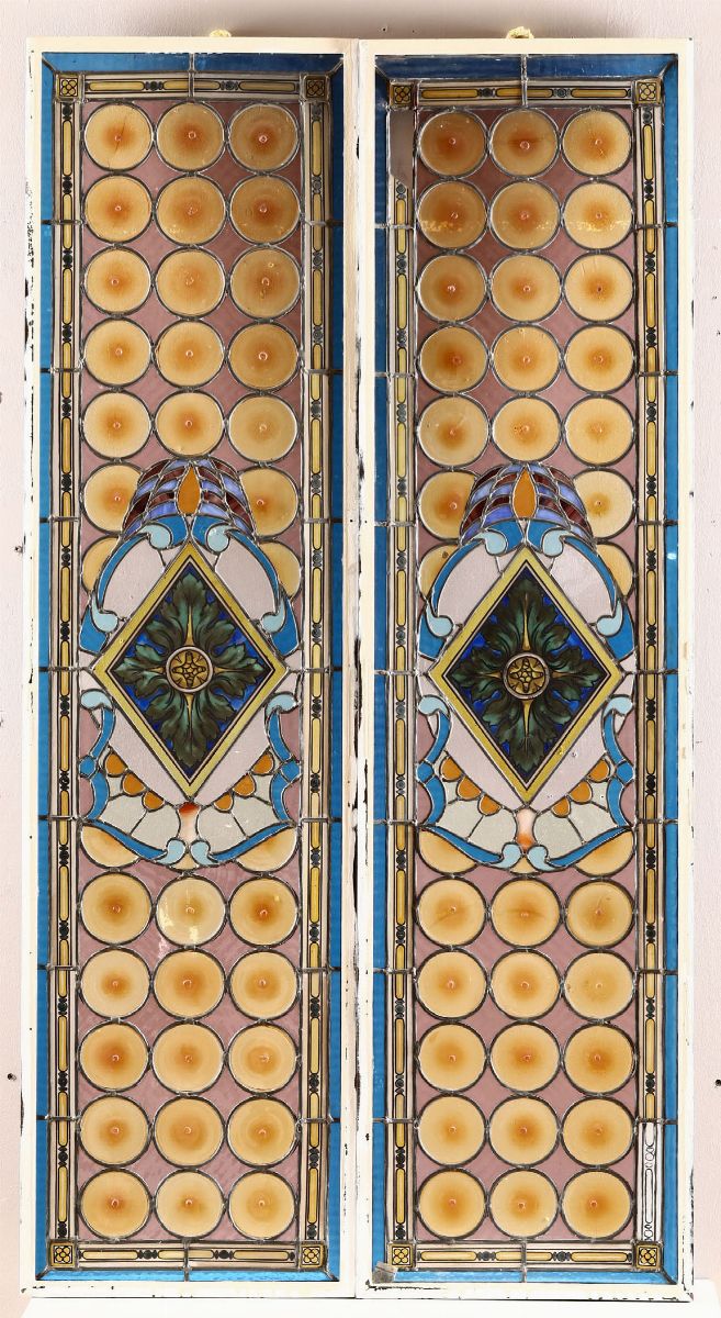 Coppia di vetrate policrome, vetreria artistica del XX secolo