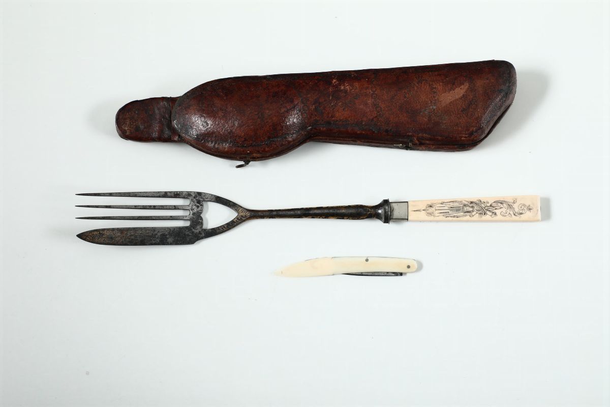 Forchettone in argento con manico in avorio, Europa XVIII secolo