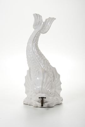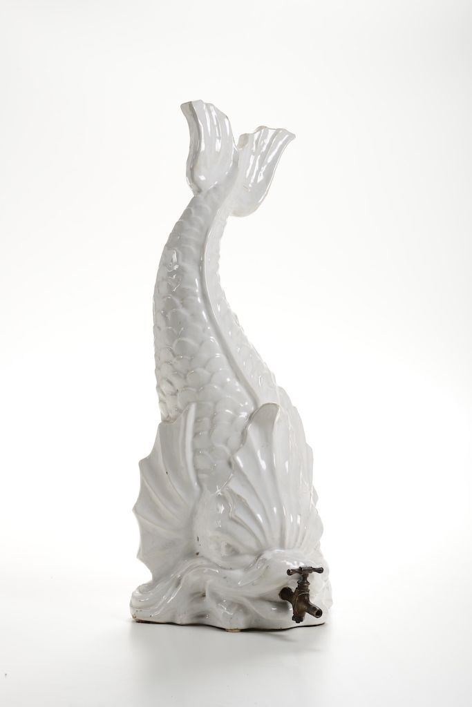 La fontana é modellata a forma di delfino guizzante. Un antico rubinetto in ottone é innestato nella bocca