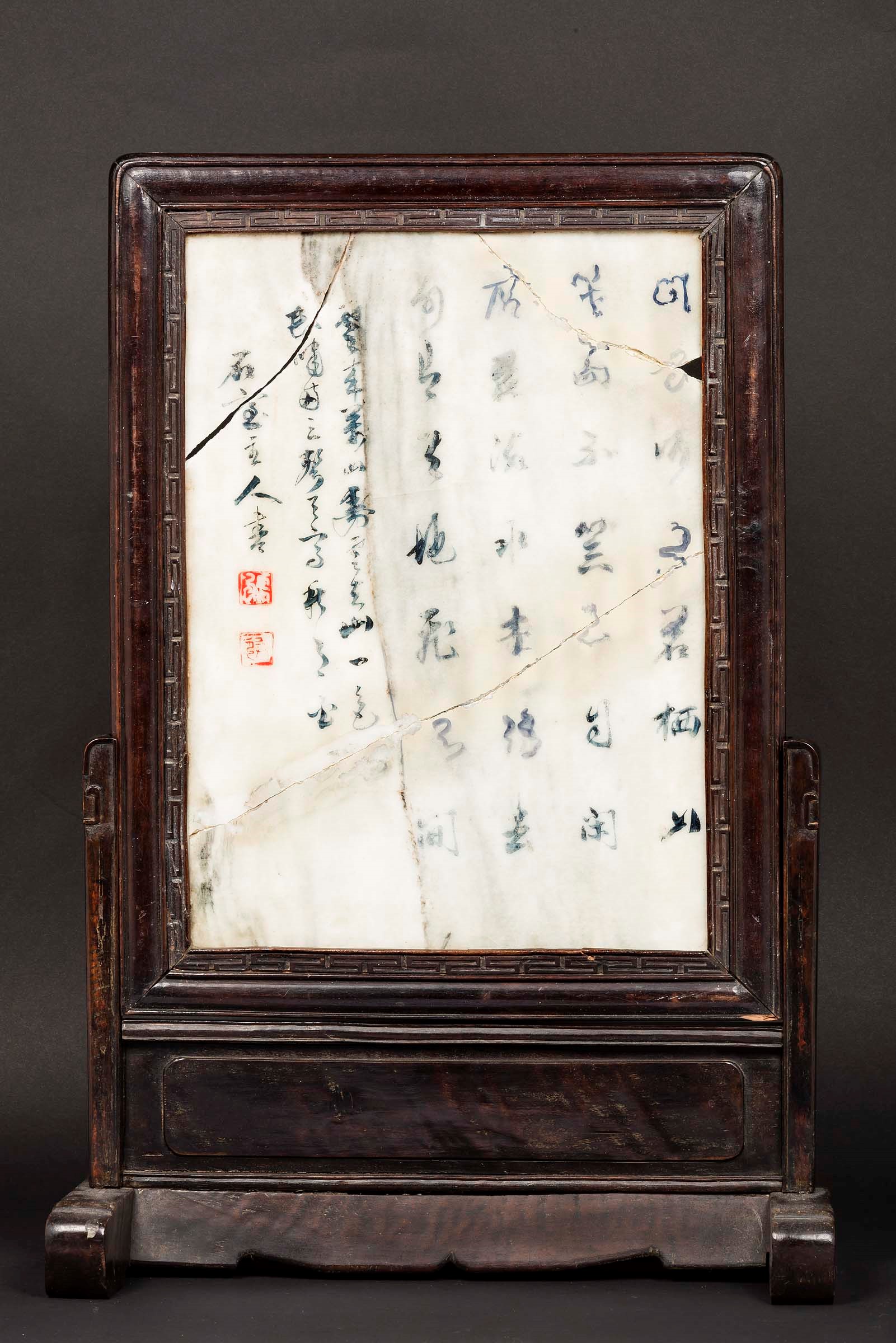 Paravento da tavolo con placca in porcellana a smalti policromi con figure, Cina
