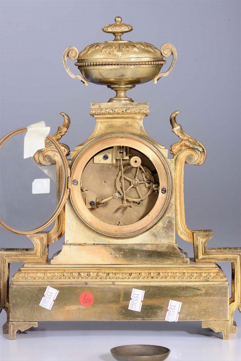 Pendola da tavolo in bronzo dorato con inserti in porcellana, Francia, XIX secolo