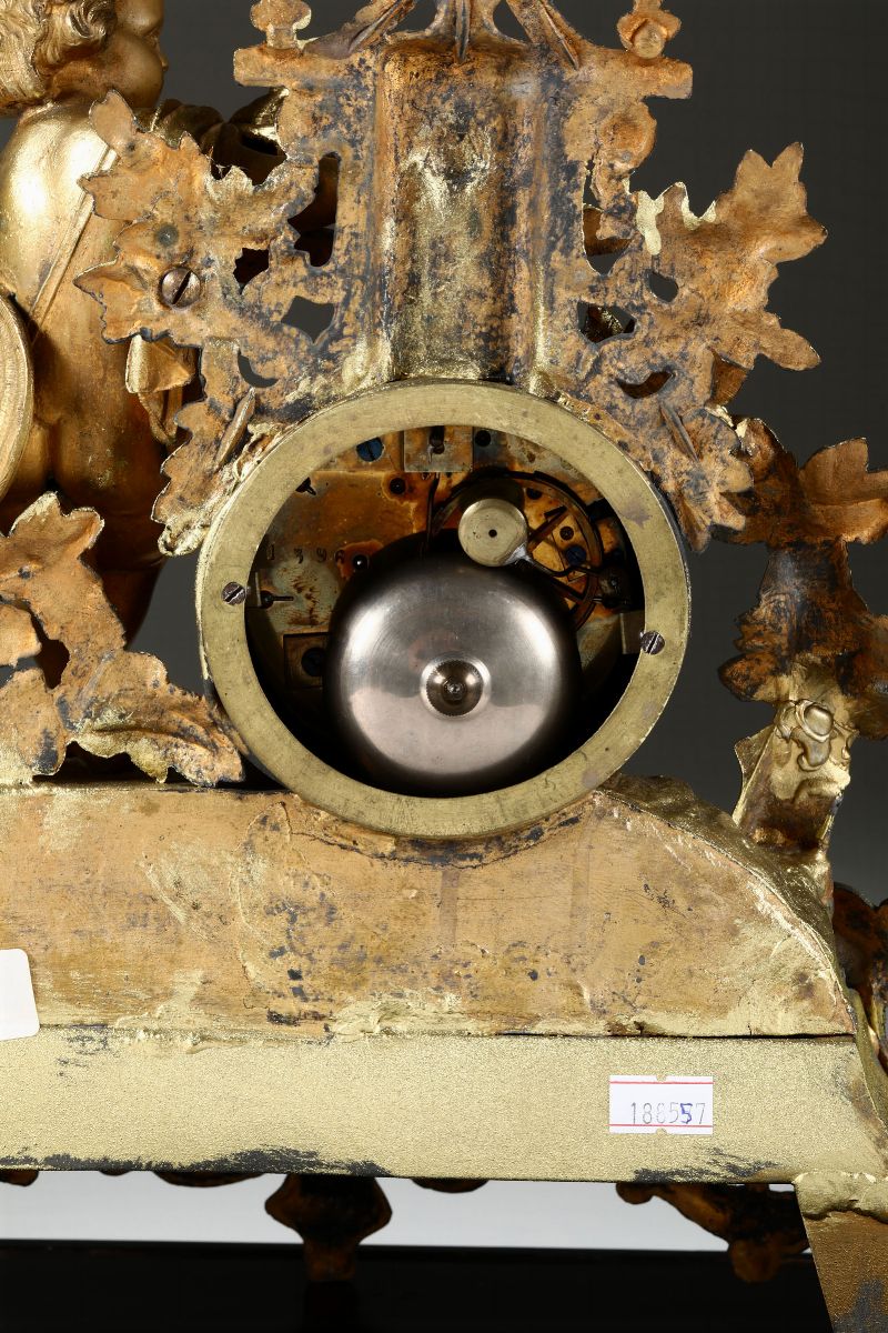 cassa sagomata con figura di putti a fianco del quadrante smaltato a numerazione romana in nero, entro campana in vetro