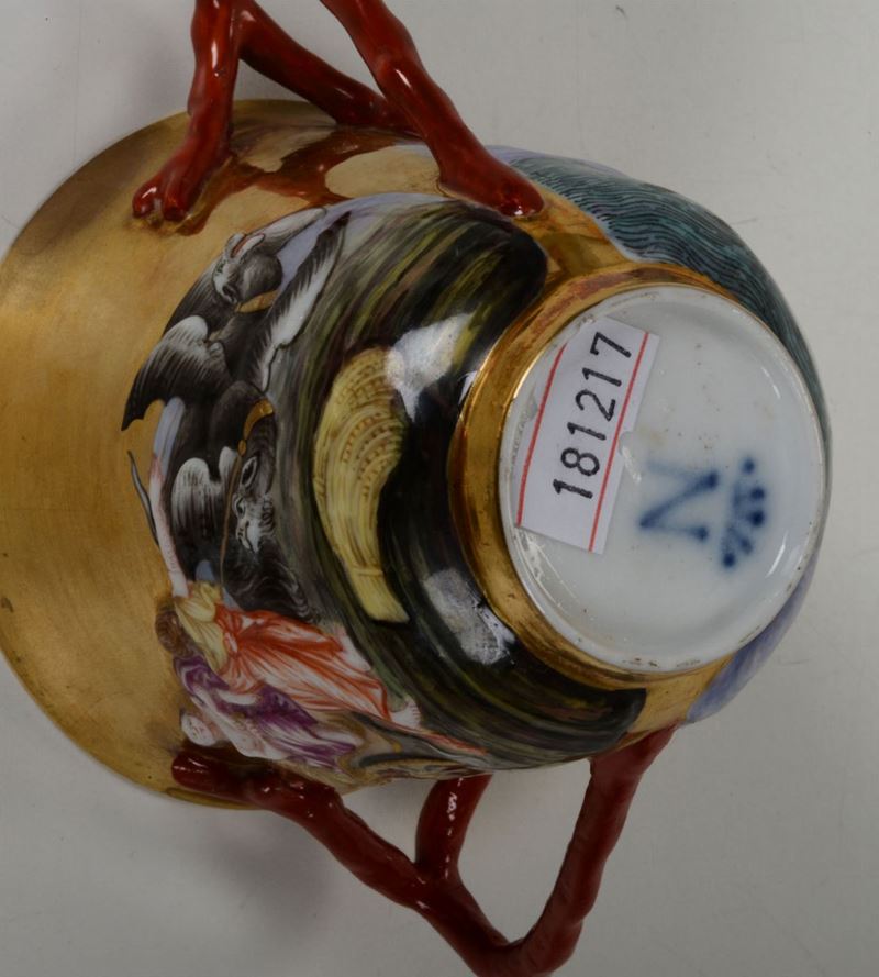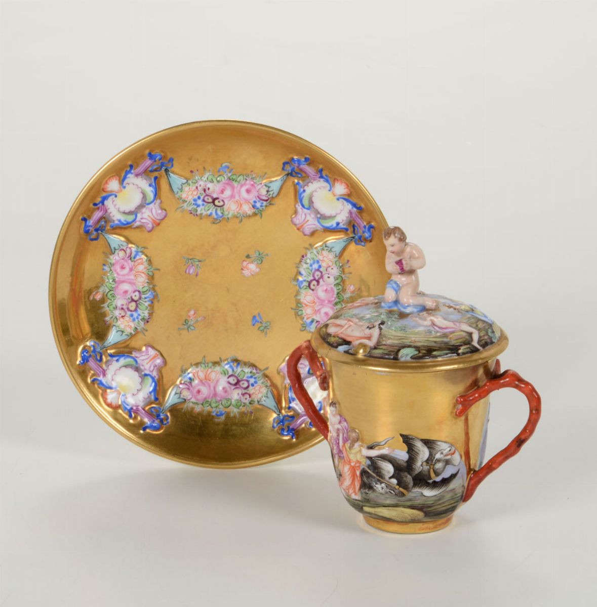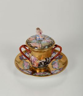 Porcellana. Marca: “N” con corona, in blu; sul piattino. Alt. tazza cm 12,3; diam. piattino cm 14,8. Restauri al putto del coperchio, ad un manico ed al bordo della tazza