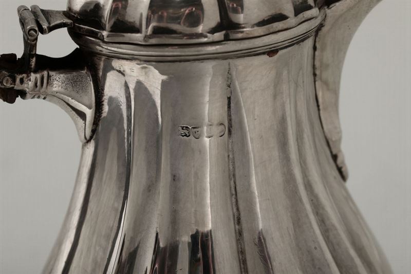 Caffettiera in argento fuso, sbalzato e cesellato. Londra XIX secolo. Bolli consunti di difficile lettura.