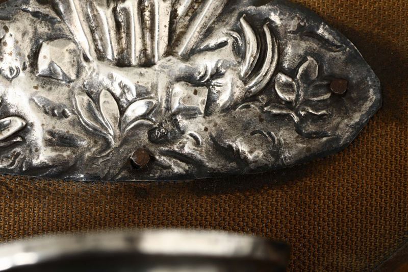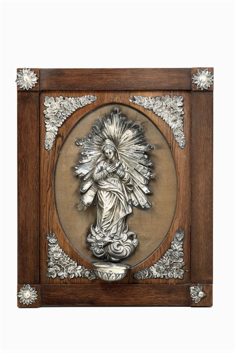Coppia di acquasantiere in lamina d’argento sbalzato e cesellato; legno. Genova, marchio della Torretta per l’anno 1823.