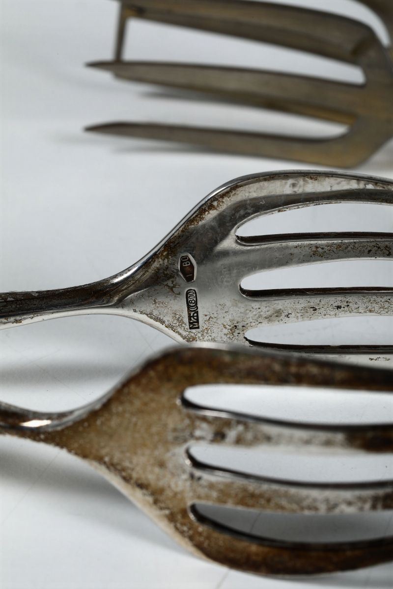 Coppia di pinze da dolci in argento, uno Clementi, Bologna XX secolo