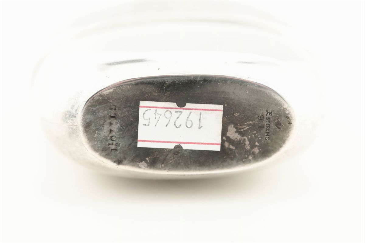 Fiasca da tasca in argento sterling fuso, sbalzato, cesellato e traforato e vetro. Manifattura inglese o statunitense del [..]