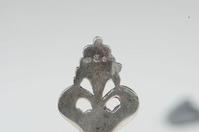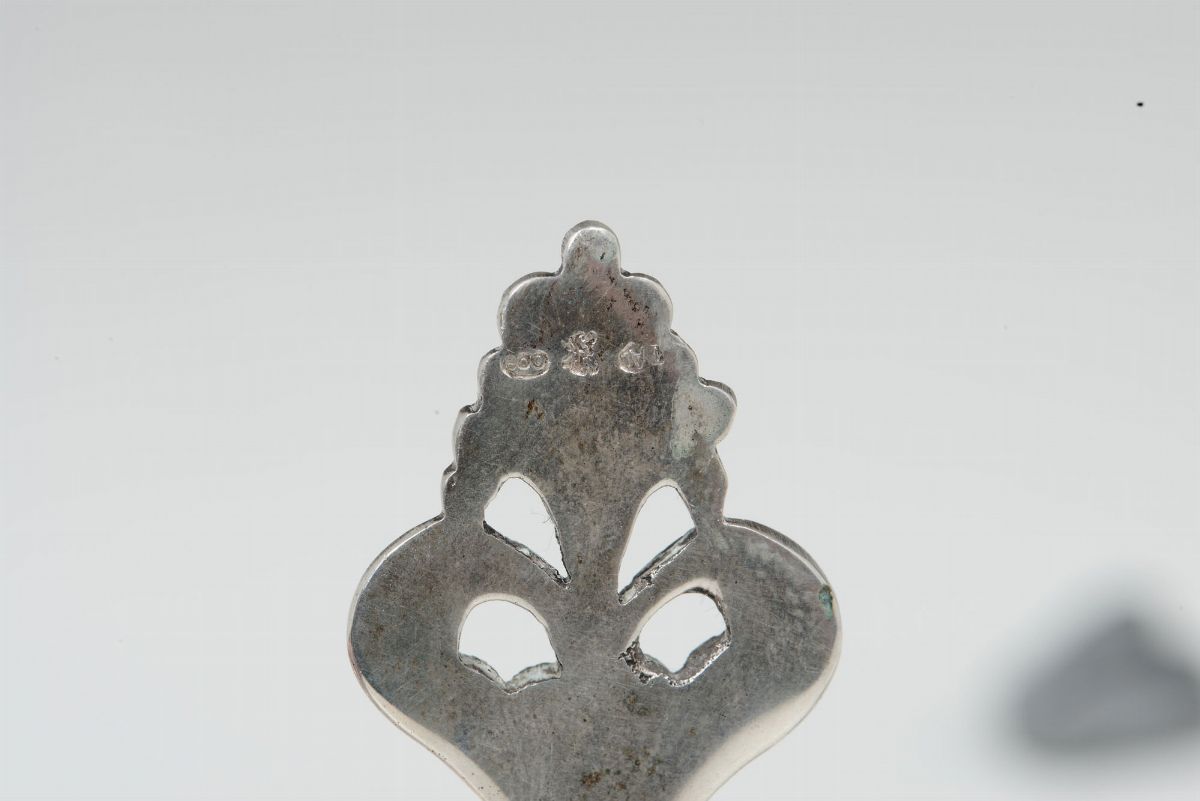 Porta biglietti sagomato in argento fuso, traforato e cesellato. Manifattura italiana metà del XX secolo, argentiere Cesa