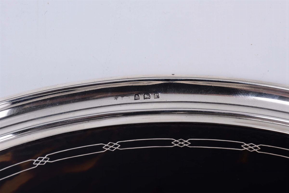Salver ovale in argento e simil tartaruga con incisioni, Birmingham 1916