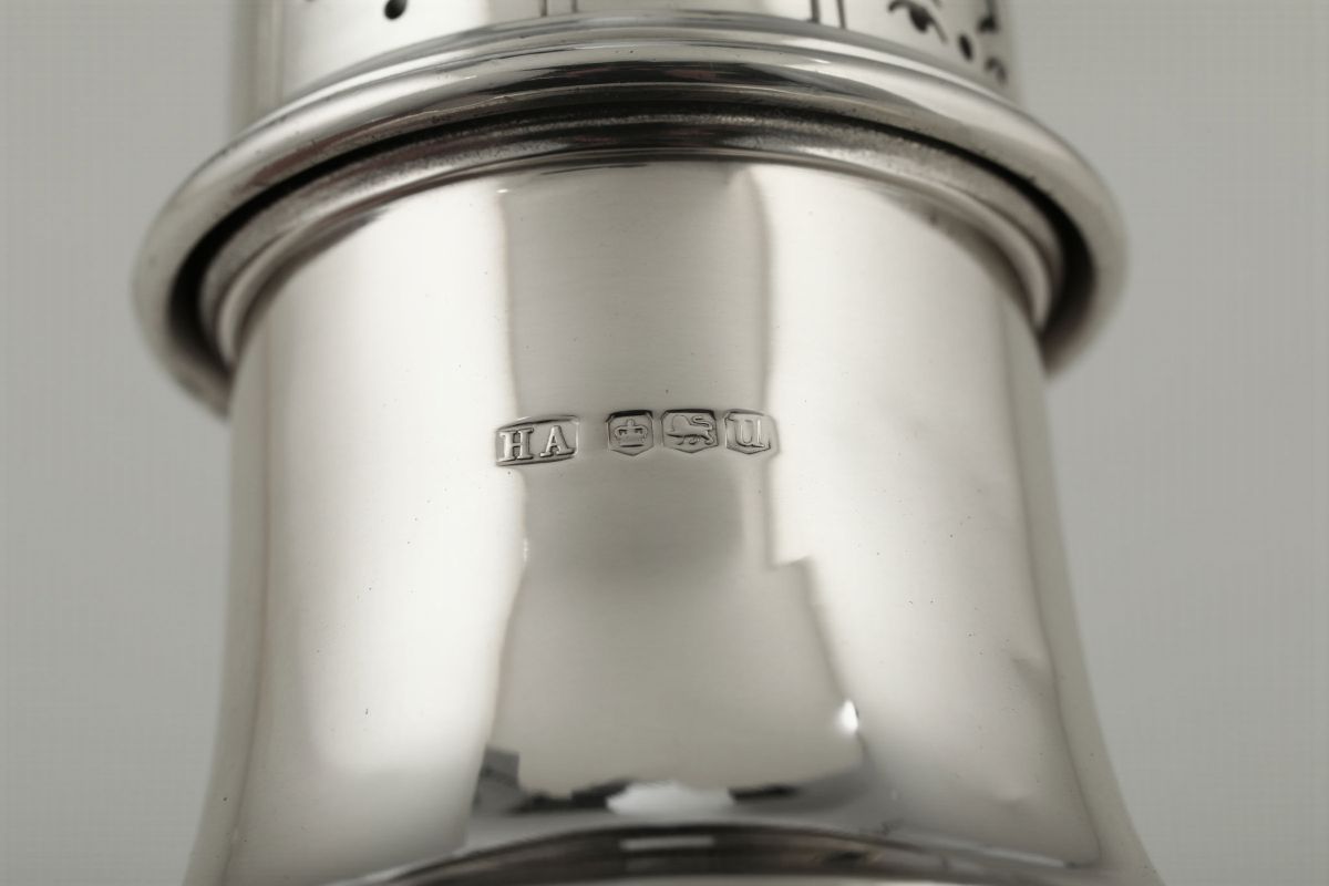 Spargizucchero in argento fuso, cesellato e traforato, bolli della città di Sheffield per l'anno 1937 e dell'argentiere HA (non identificato)