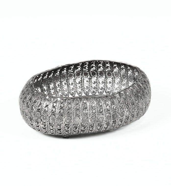Vaschetta ovale con bordo bombato e riccamente lavorato con motivi a volute, XIX secolo