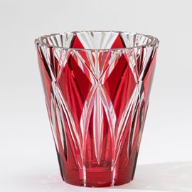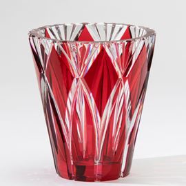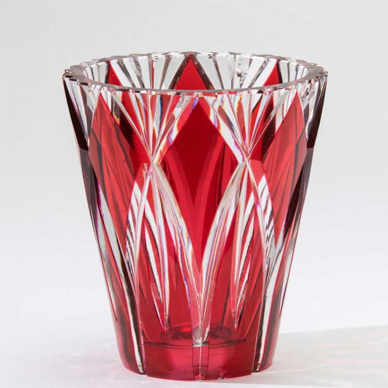 Vaso in cristallo molato trasparente e rosso con decoro geometrico.