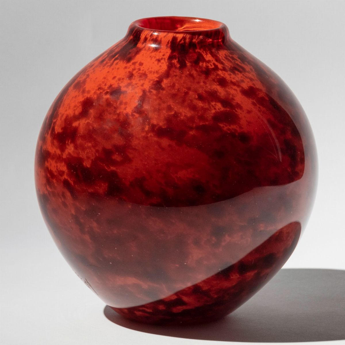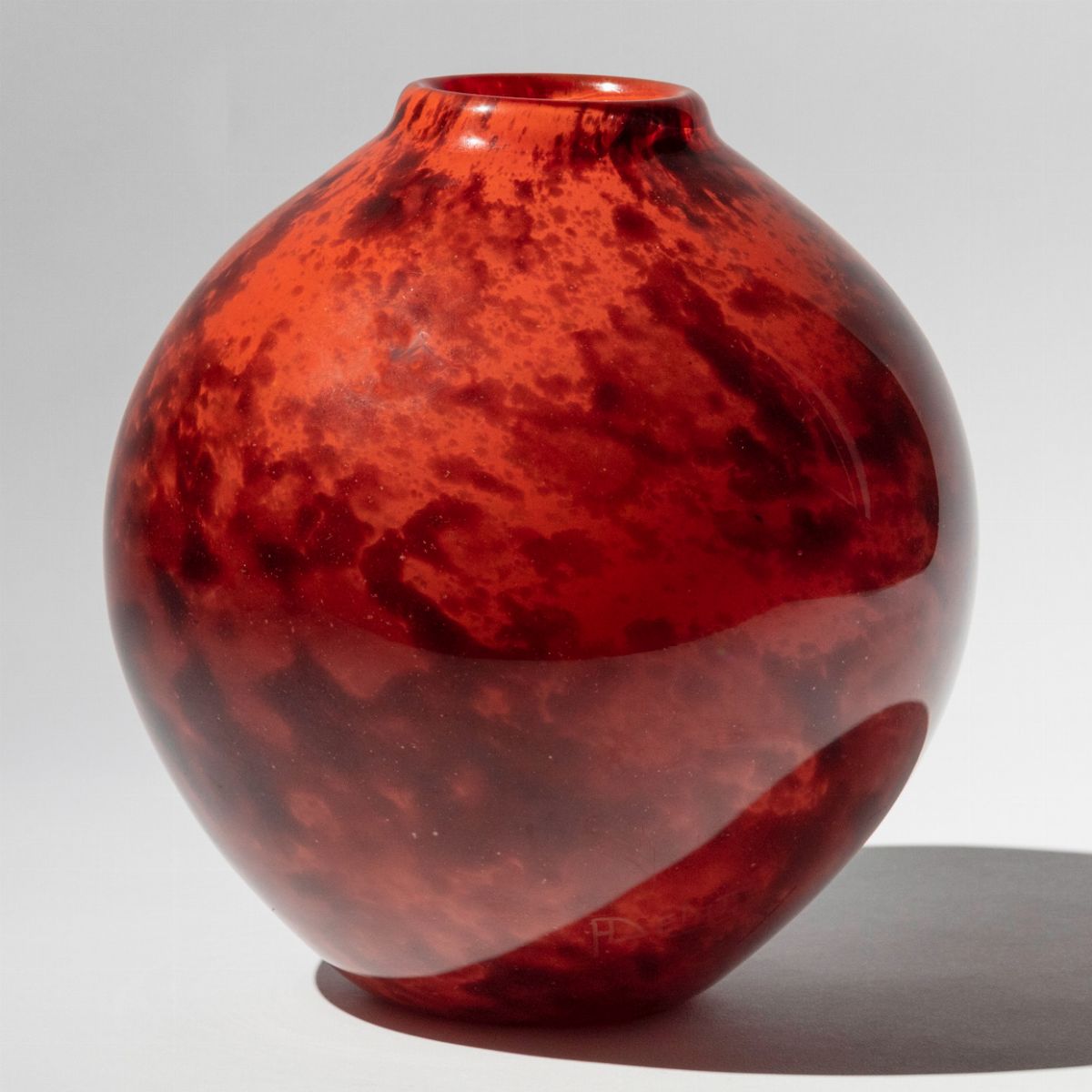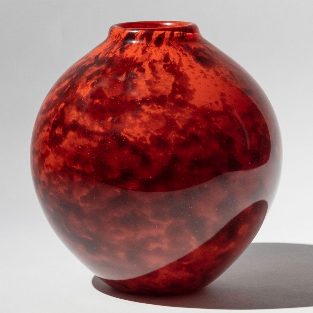 Vaso in vetro con decoro di macchie nei toni del rosso.
