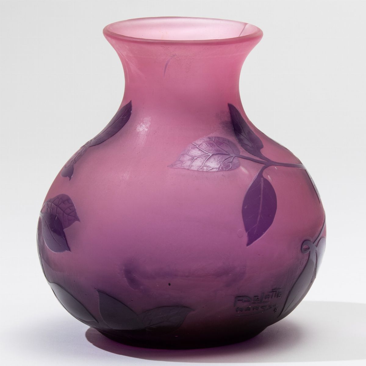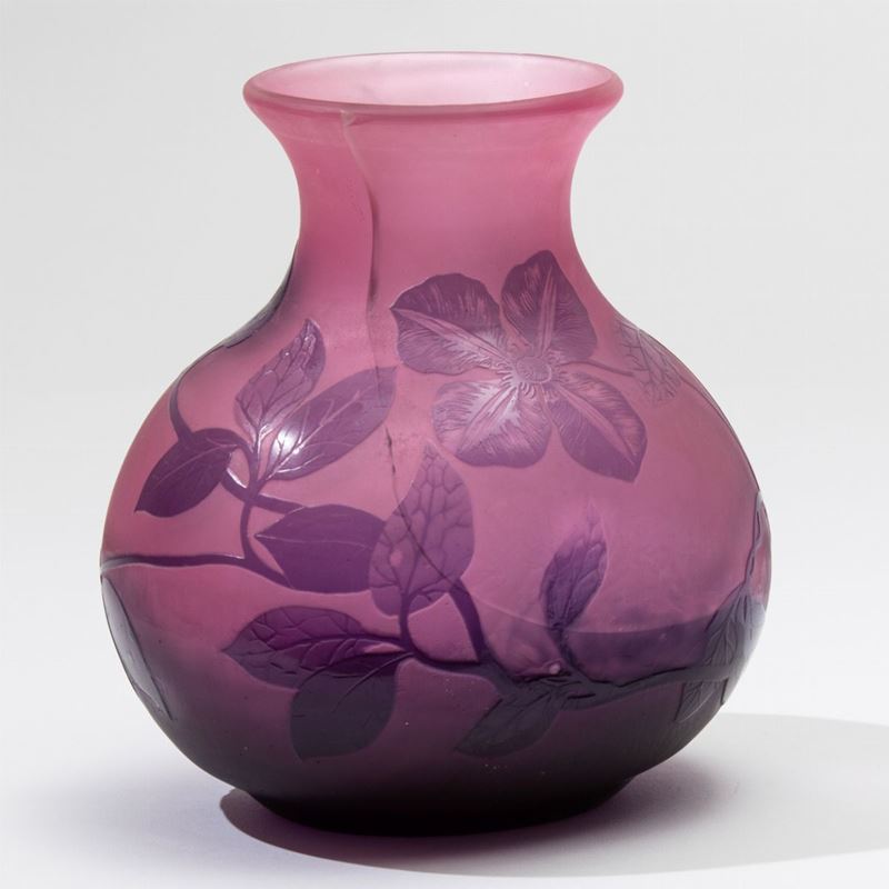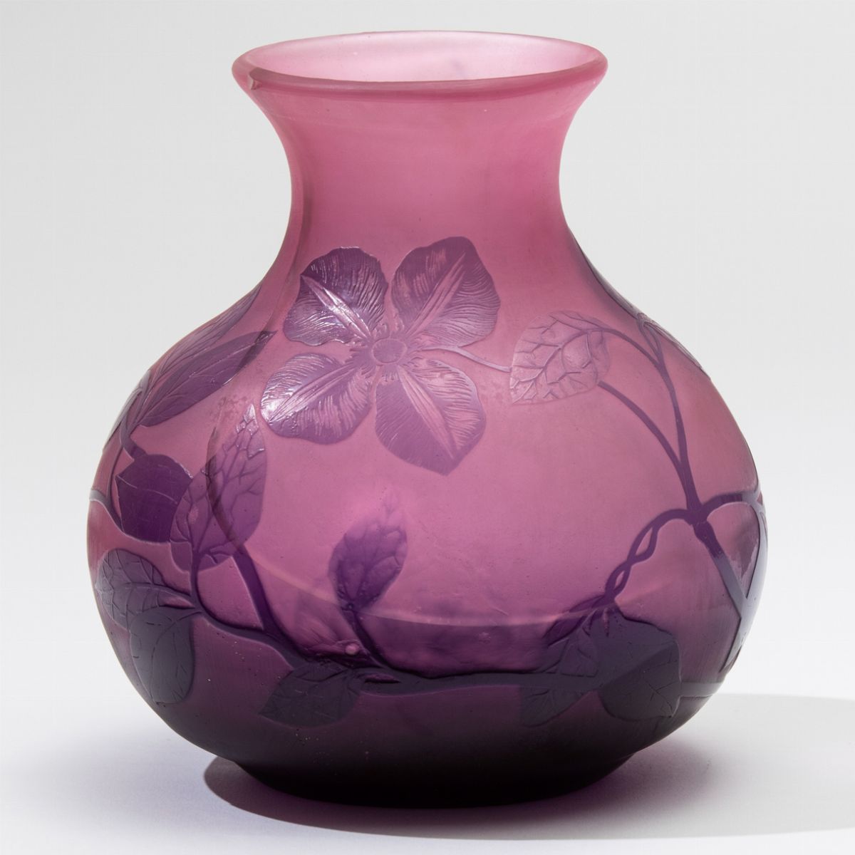 Vaso in vetro a cammeo sui toni del viola con decoro floreale a rilievo.