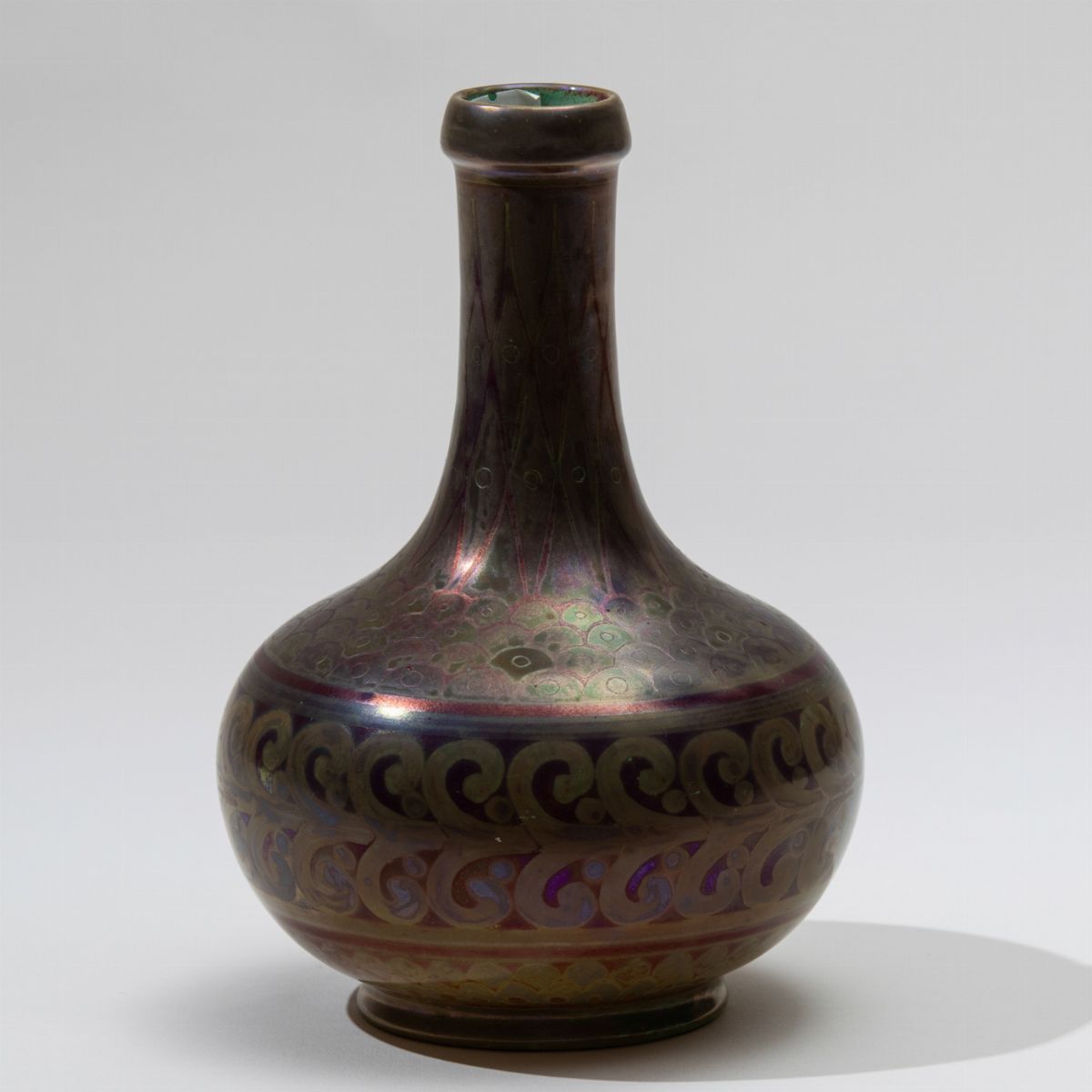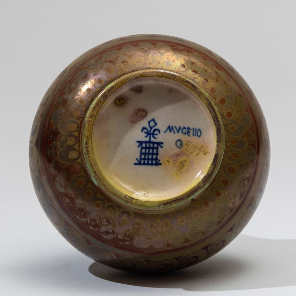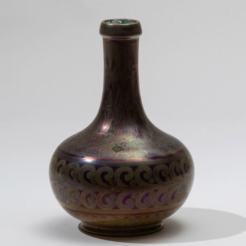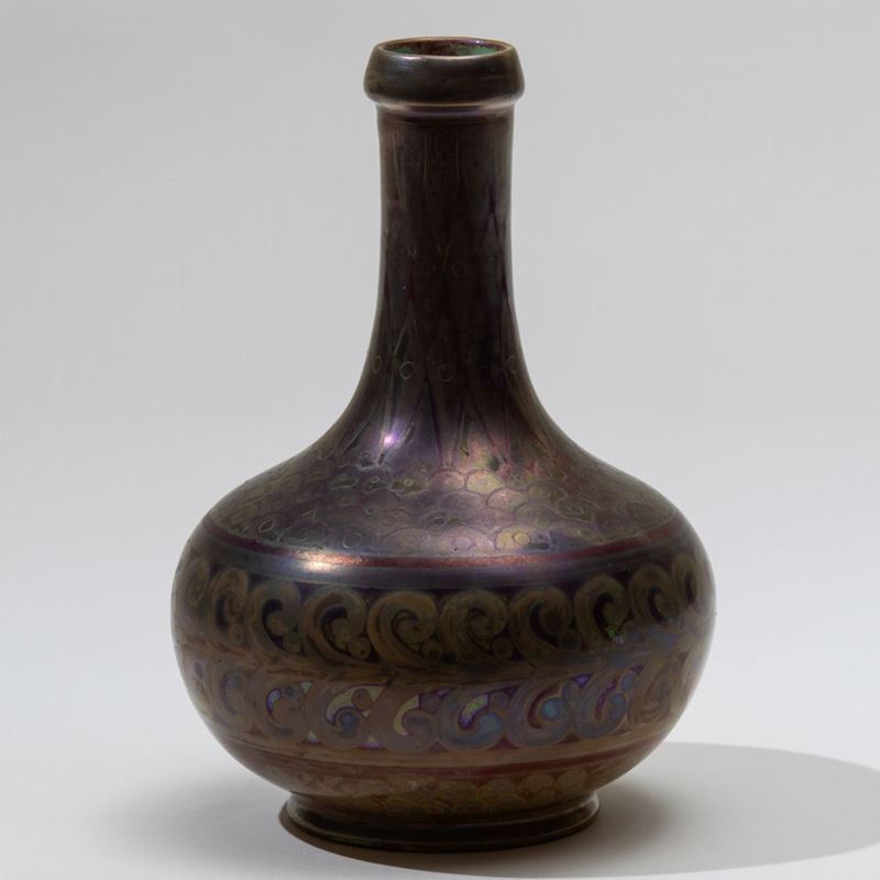 Vaso con alto collo in ceramica a lustro con decori geometrici e fascia fogliacea.