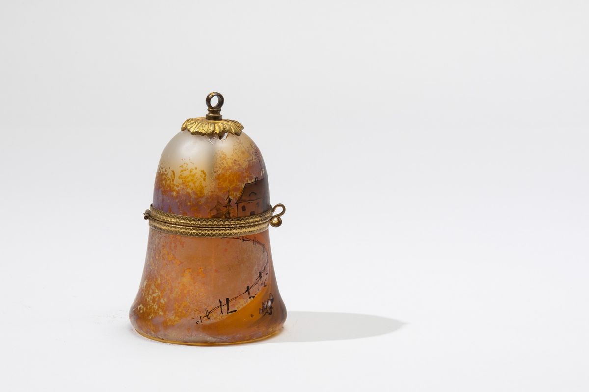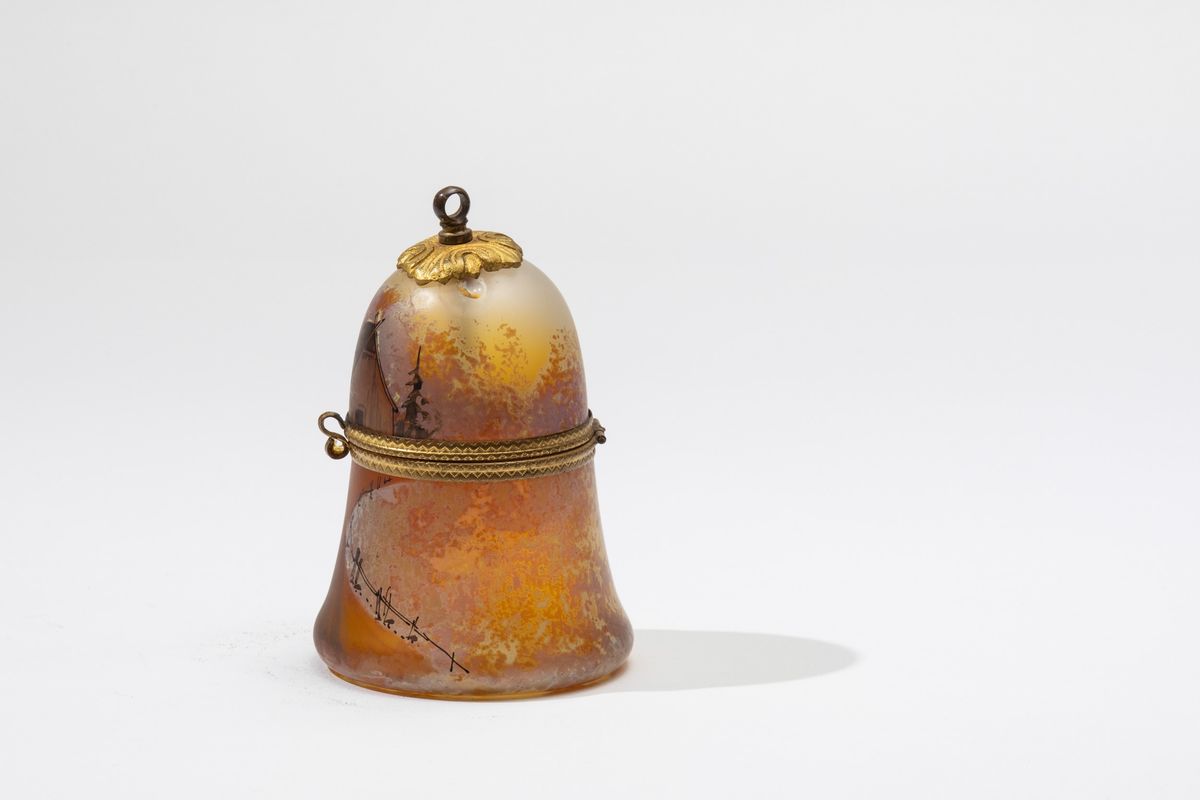 Piccola scatola a campana in vetro con decoro di paesaggio.