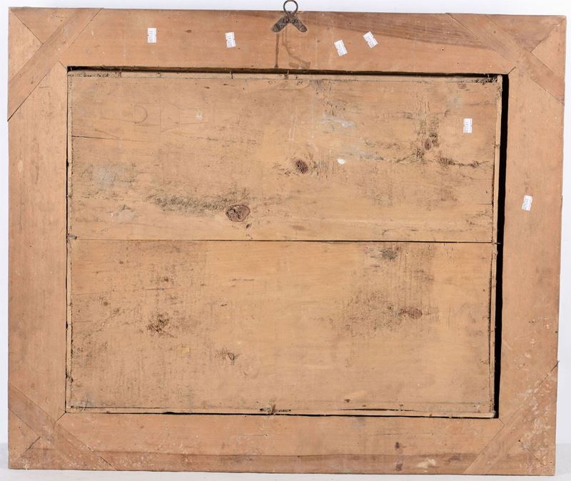 Gruppo di ex voto in cera entro cornice in legno intagliato