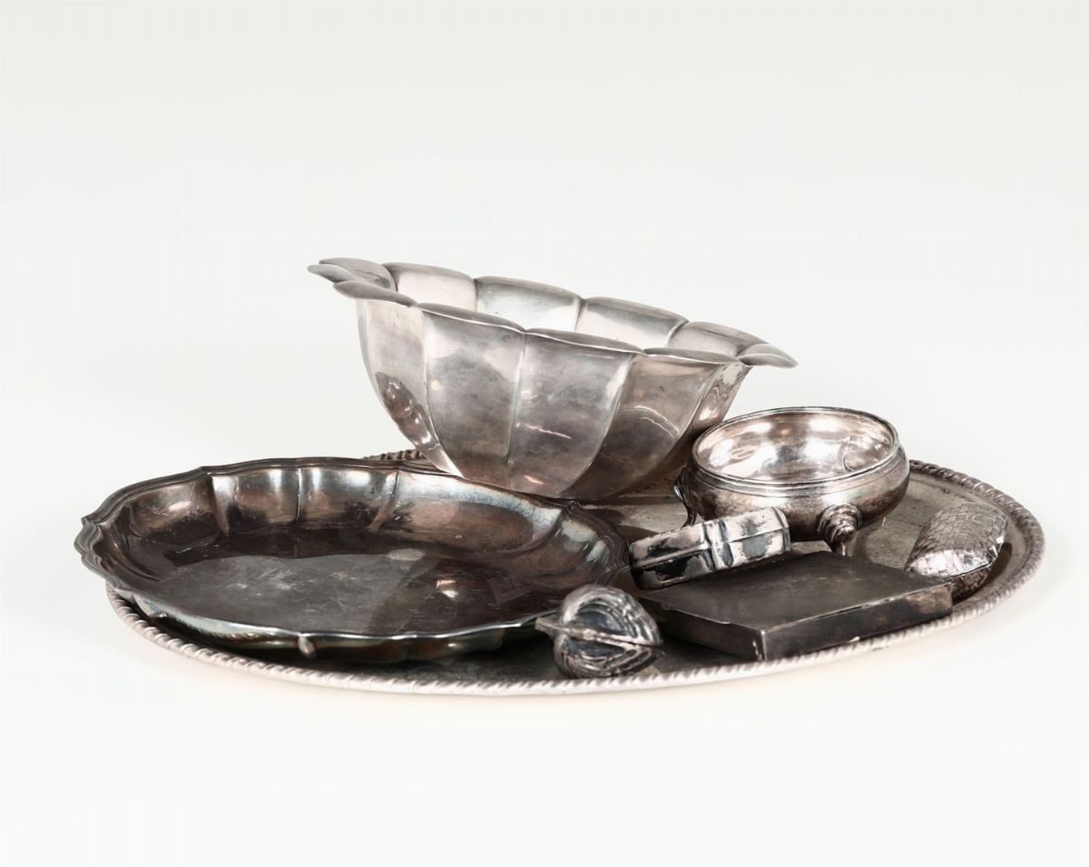 Lotto composto da un piattino, un vassoio, due saliere, un portacipria, tre scatoline portapillole in metallo argentato