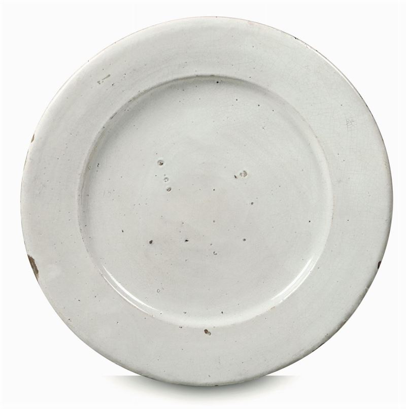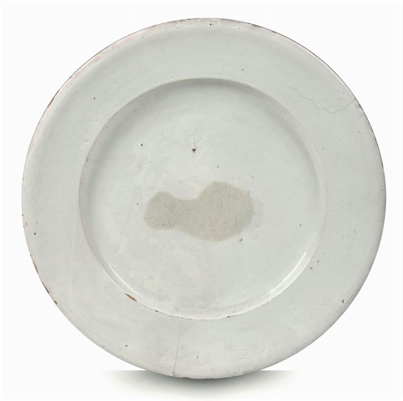 Due grandi piatti tondi piani modellati al tornio, rivestiti di smalto stannifero (molto sottile sul retro). Questa forma è coerente con la produzione dell’Italia Settentrionale d’inizio Settecento