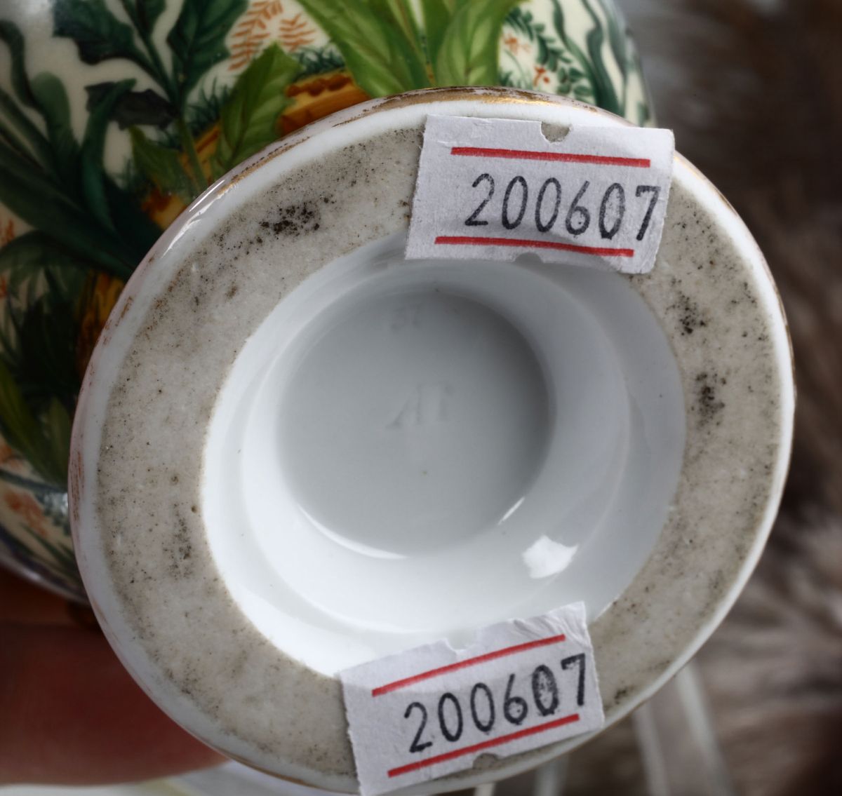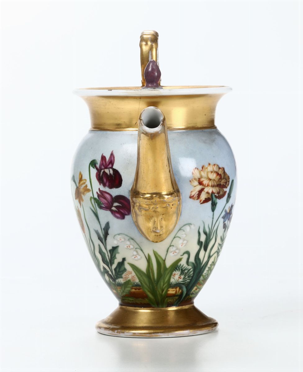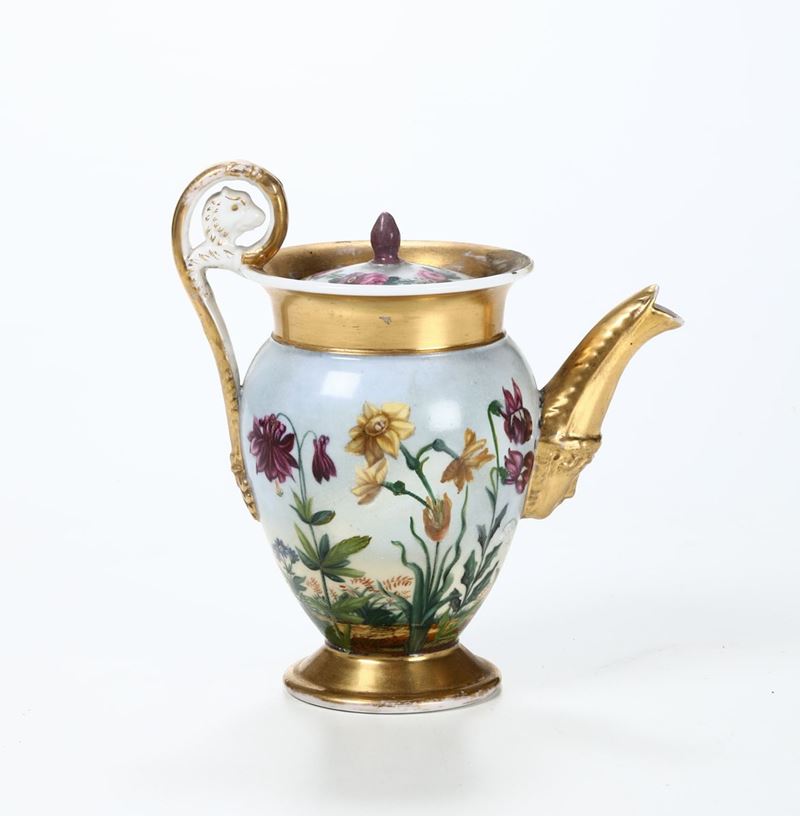Teiera in porcellana policroma con corpo decorato a tutto tondo con paesaggio fiorito. Francia, XIX secolo